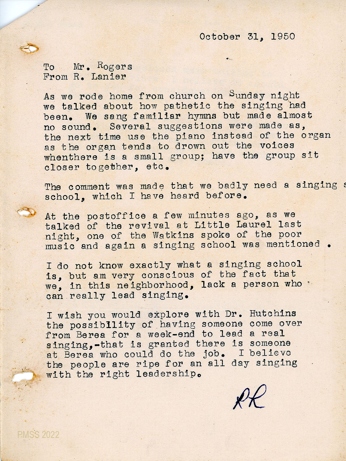 057a October 31, 1950. Memo to Rogers from R. [Ruby] Lanier who commented on the poor singing in the Chapel and the need for a “singing school.” He asks that Rogers work with Dr. [Francis] Hutchins to send someone from Berea [College] for an all-day singing.