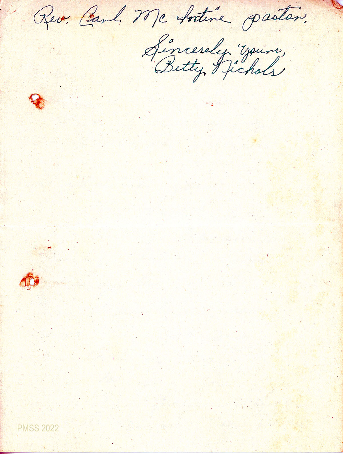 058-058a February 7, 1949. Two-page handwritten letter to “Miss Dorothy [Nace]” from Betty Nichols, Merchantville, NJ, who is joining a church in NJ, and asks for a letter of transmittal from Pine Mountain Chapel.