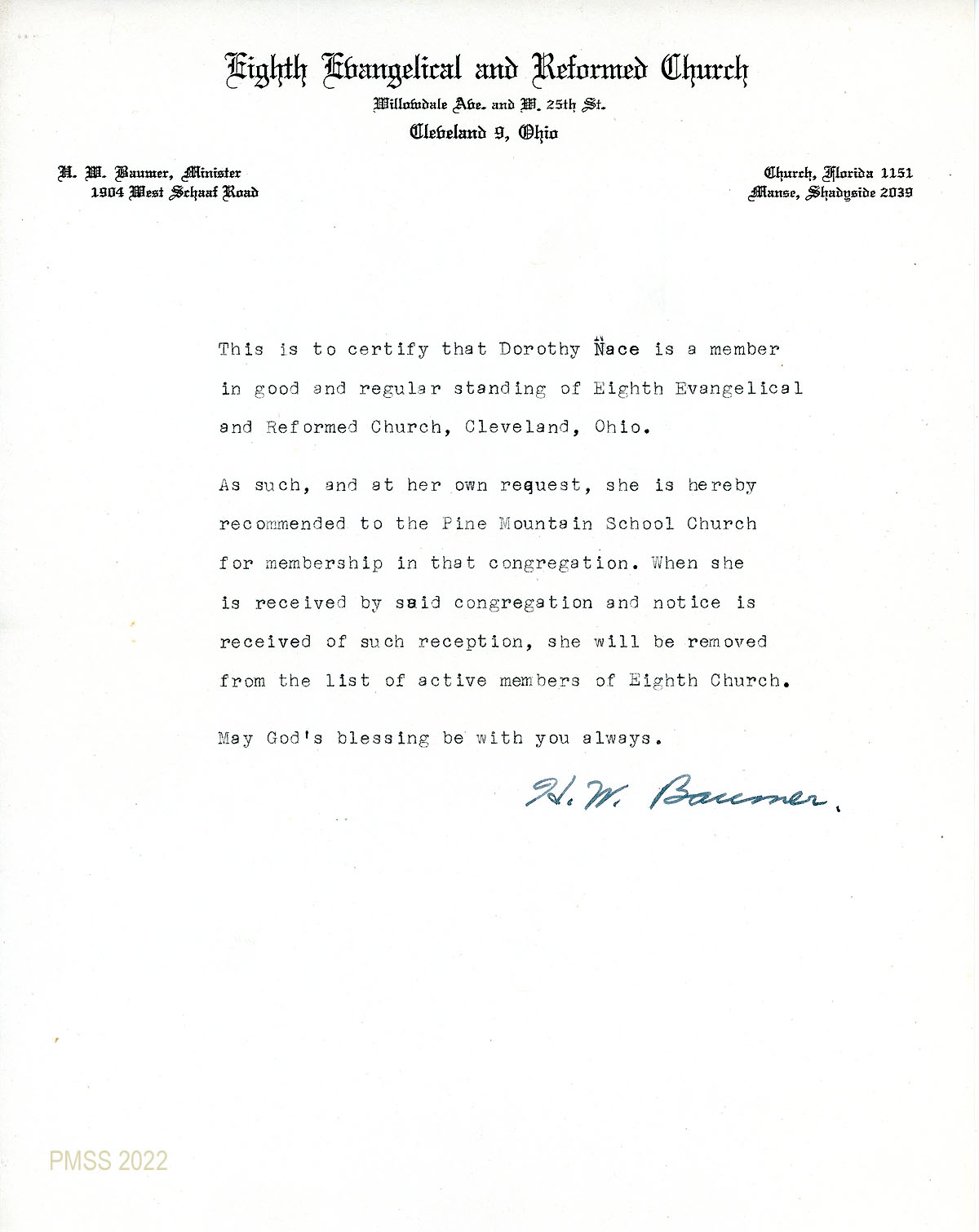 061 [No date] Letter of transfer from H.W. Baumer, Minister, Eighth Evangelical and Reformed Church, Cleveland, OH, certifying that Dorothy Nace is a member and recommending, at her request, her transfer to the Pine Mountain School Church for membership.