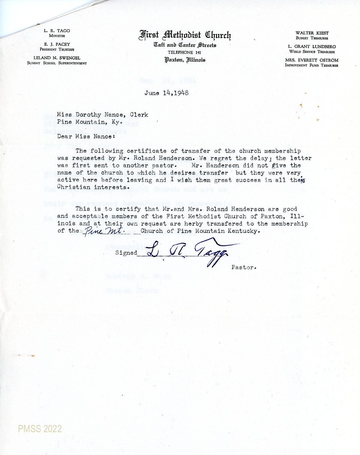 062a June 14, 1948. Letter of transfer to Dorothy Nace, from L.R. Tagg, Pastor, First Methodist Church, Paxton, IL, certifying that Mr. and Mrs. Henderson were members and have asked to be transferred to Pine Mountain Church membership.