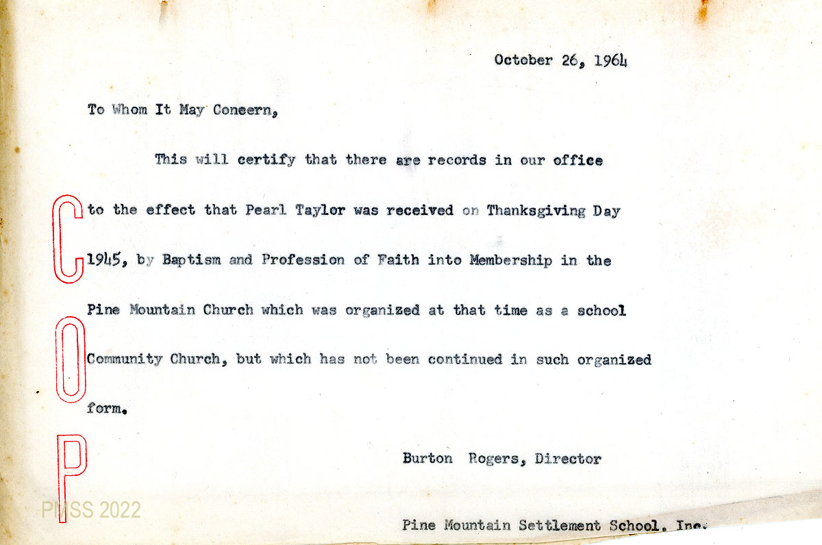 063 October 26, 1964. Memo “To Whom It May Concern” from Burton Rogers, PMSS Director, certifying that records in his office that Pearl Taylor was baptized on Thanksgiving Day 1945 “in the Pine Mountain Church which was organized at that time as a school Community Church, but which has not been continued in such organized form.”