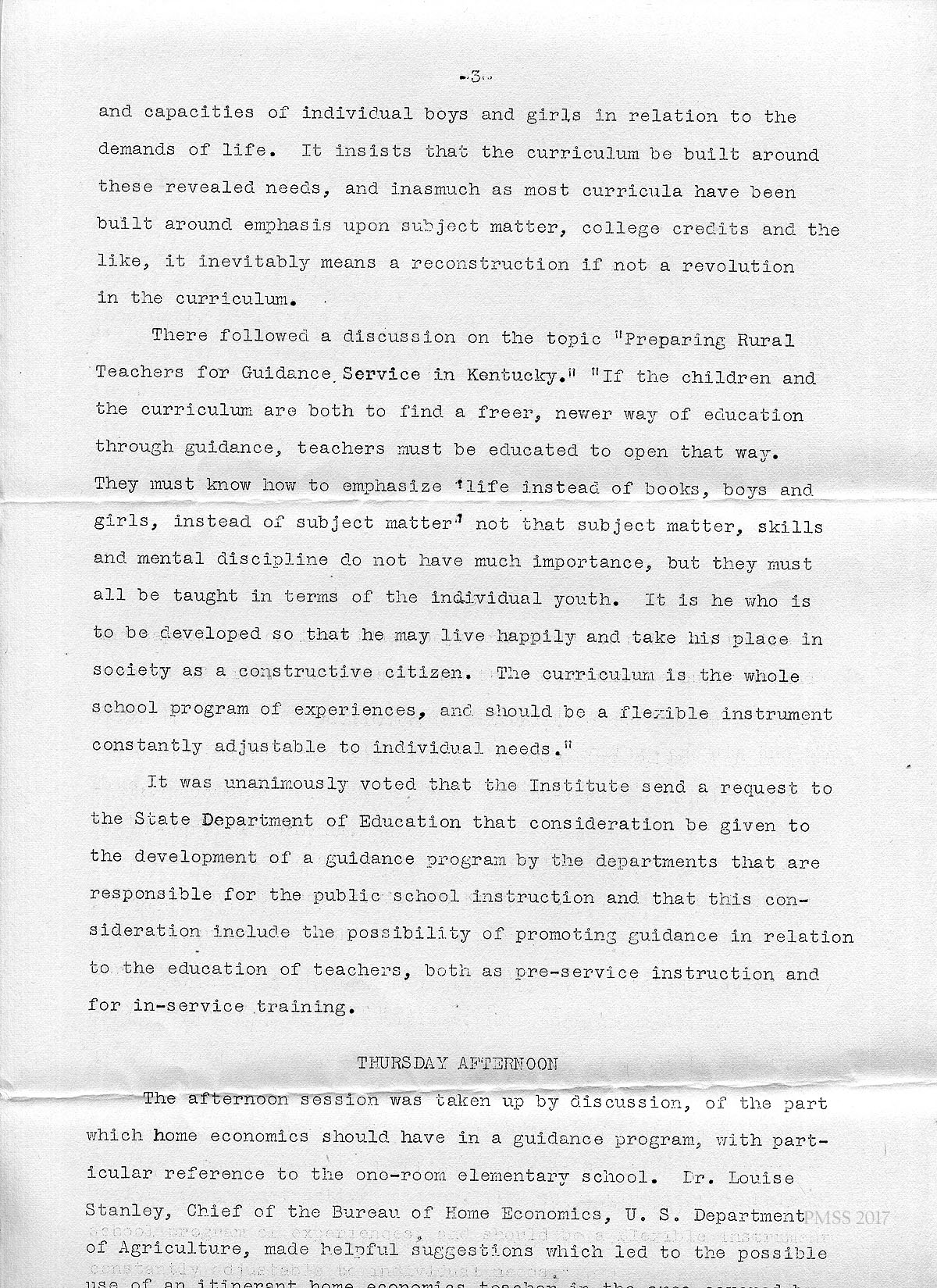 There followed a discussion on the topic “preparing Rural Teachers for Guidance Service in Kentucky.” “If the children and the curriculum are both to find a freer, newer way of education through guidance, teachers must be educated to open that way. They must know how to emphasize life instead of books, boys and girls, instead of subject matter — not that subject matter, skills and mental discipline do not have much importance, but they must all be taught in terms of the individual youth. It is he who is t be developed so that he may live happily and take his place in society as a constructive citizen. The curriculum is the whole school program of experiences and should be a flexible instrument constantly adjustable to individual needs.”