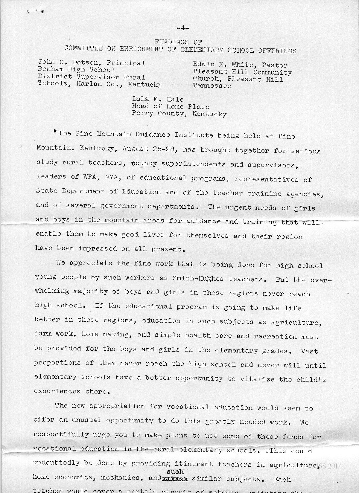 “To approach this matter from an experimental basis we would suggest that a group of eleven rural schools in the Pine Mountain area would be an ideal field in which to start. Here is a more or less homogeneous region where a good deal of interest in those subjects has already been aroused and where some fine cooperation could be counted on from the workers in Pine Mountain Settlement School, county educational authorities, and people of the community”