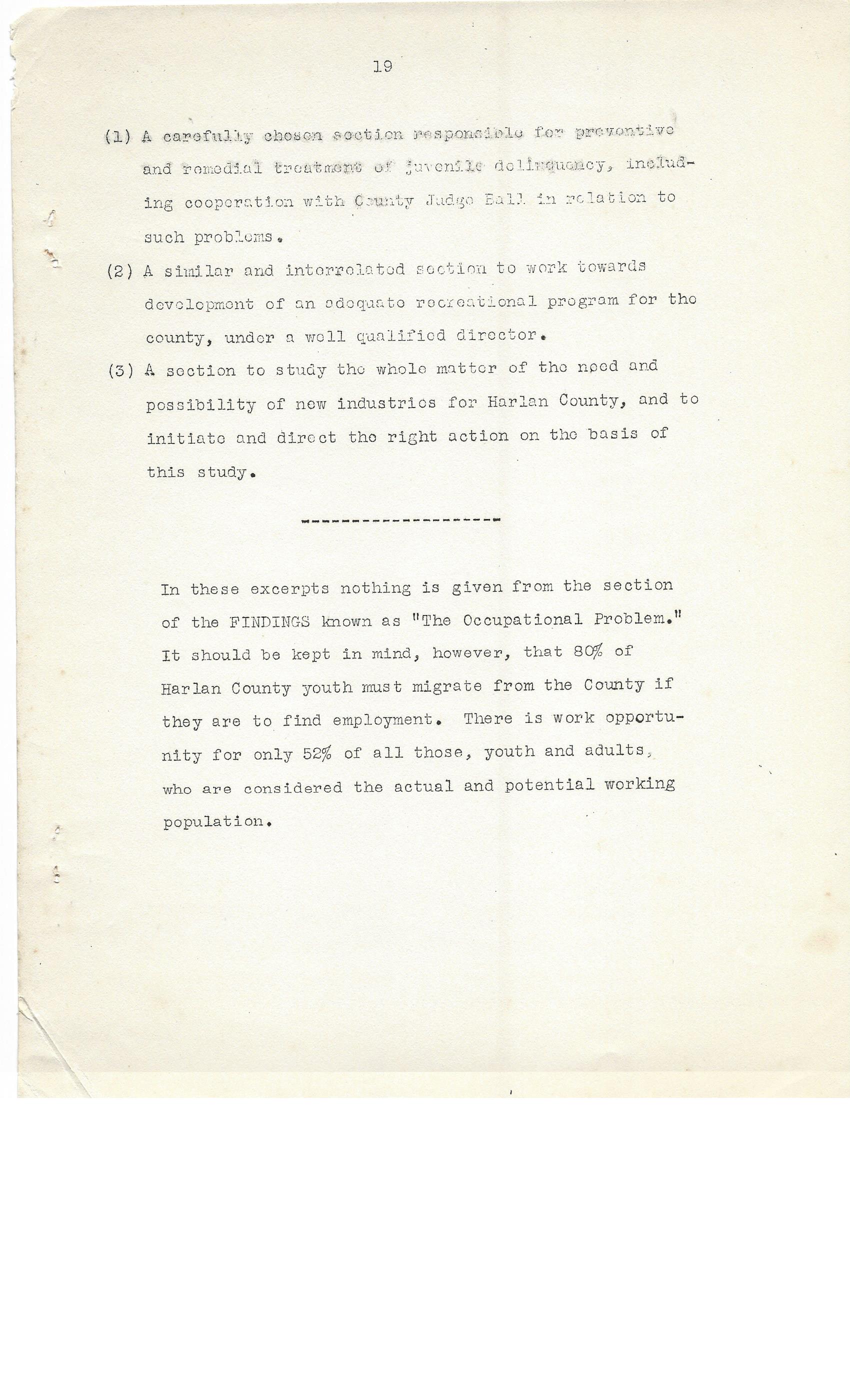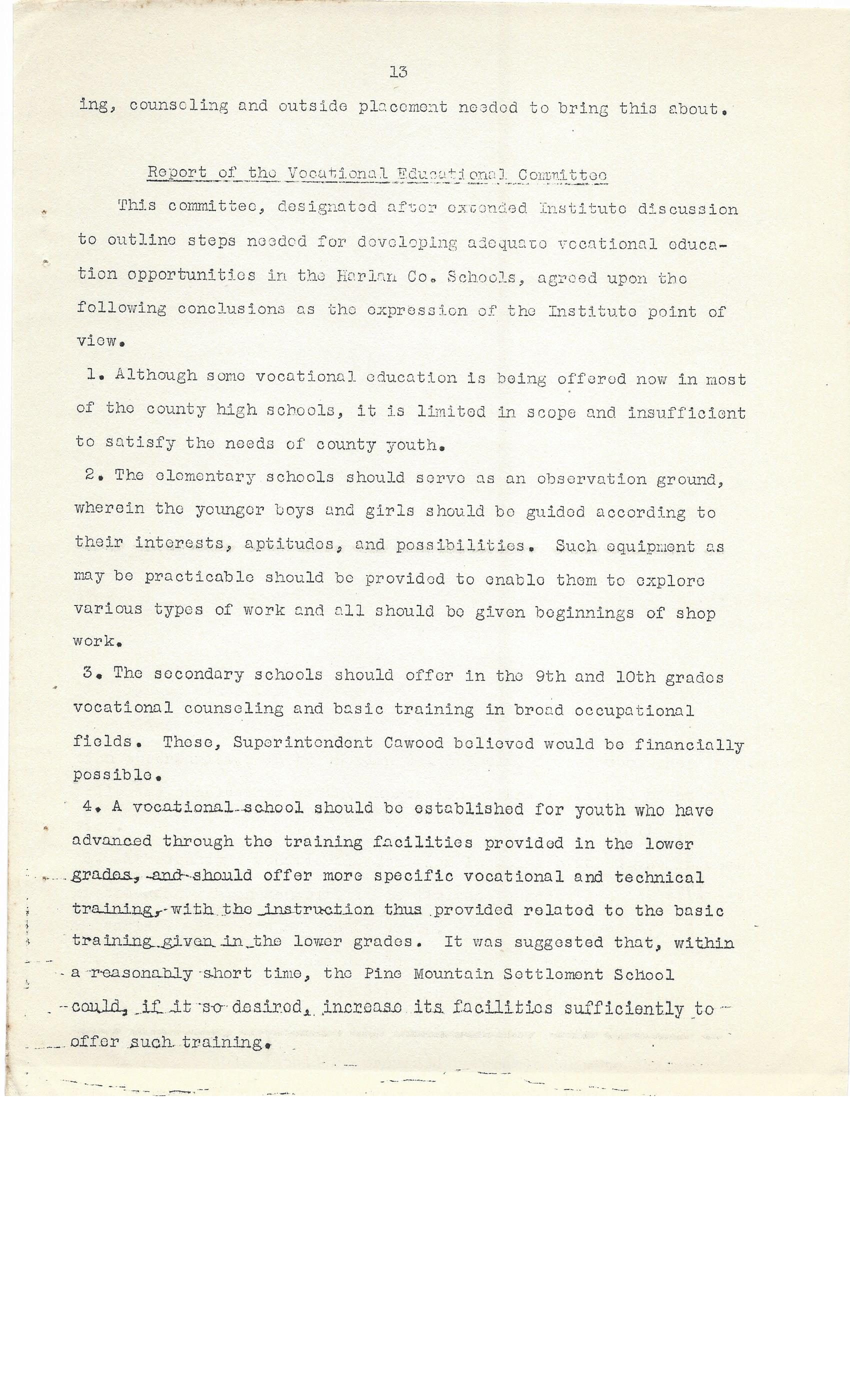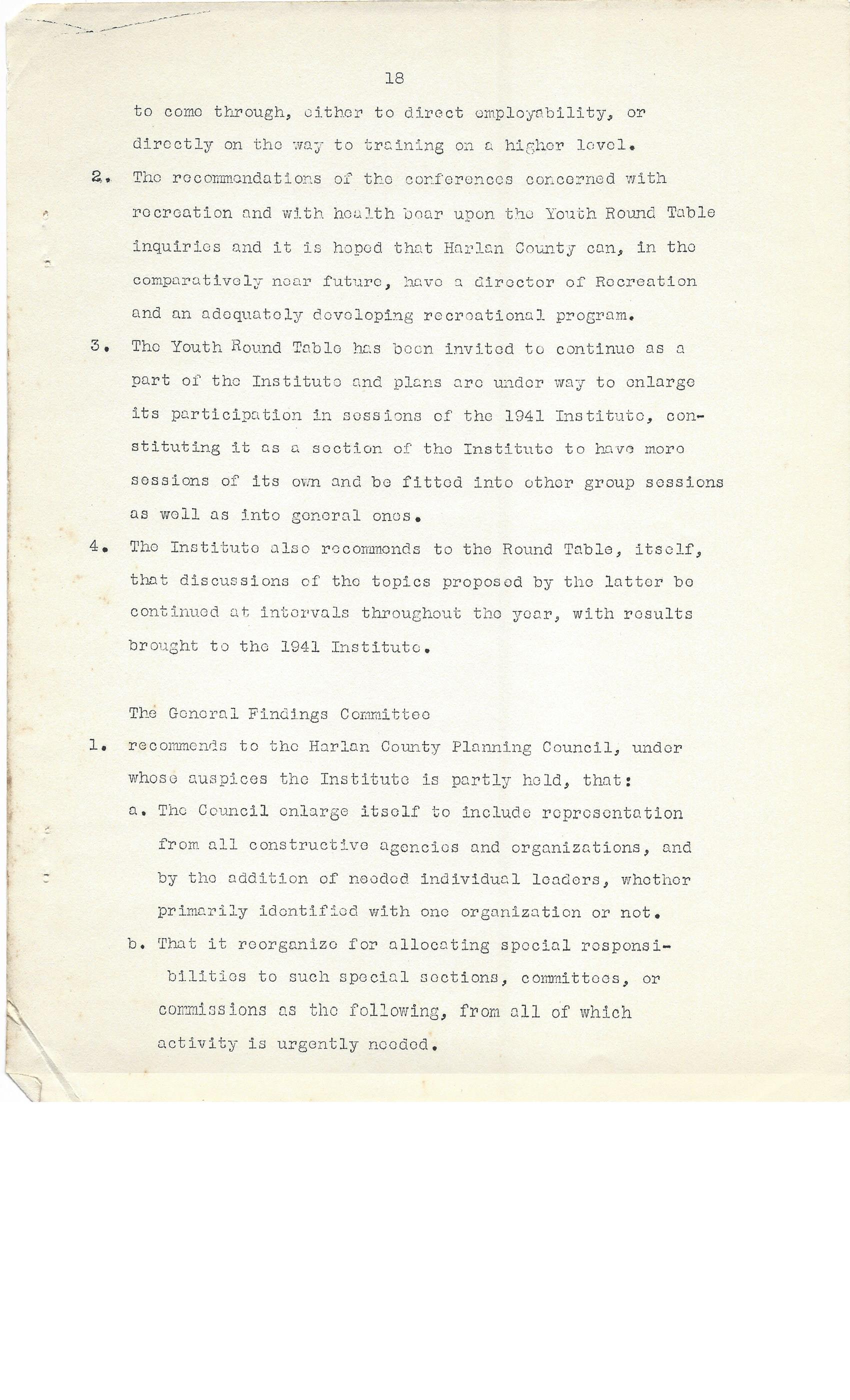 Excerpts taken from the findings of the 1940 RURAL YOUTH GUIDANCE INSTITUTE an annual week-long meeting of Harlan County teachers, parents, ministers, and other youth leaders from across the country. It was held at the Pine Mountain Settlement School where most of the earlier meetings had been located. The Alliance for Guidance of Rural Youth of Richmond, Virginia, sponsored the meeting.