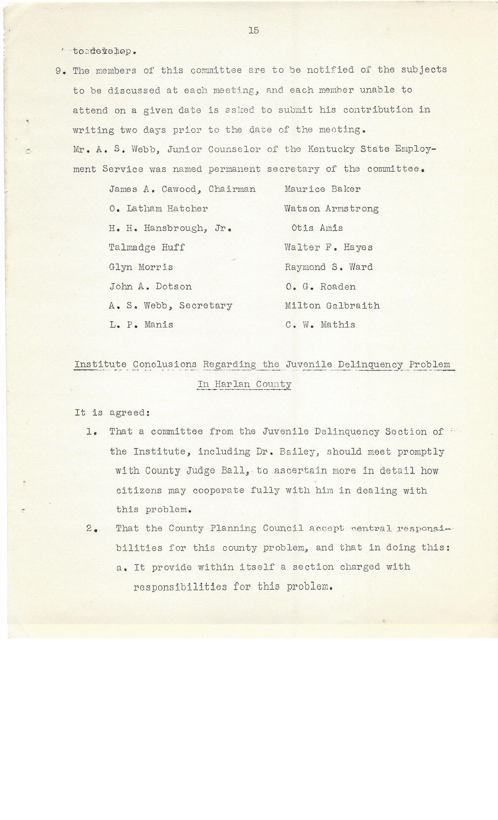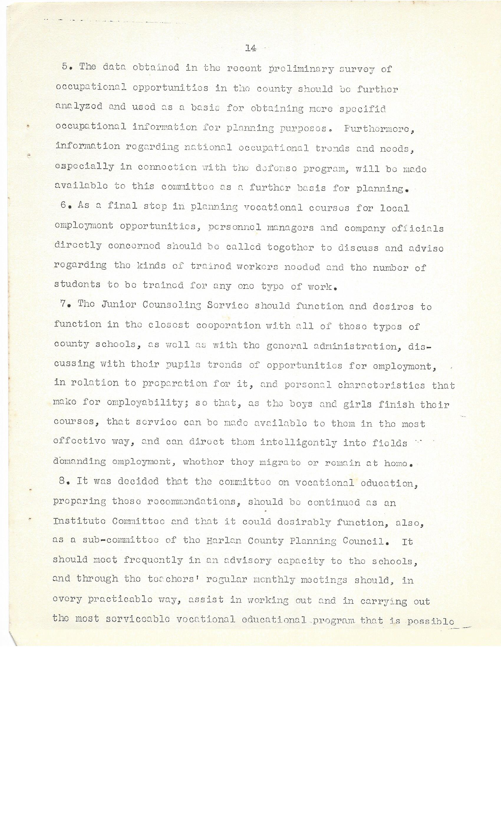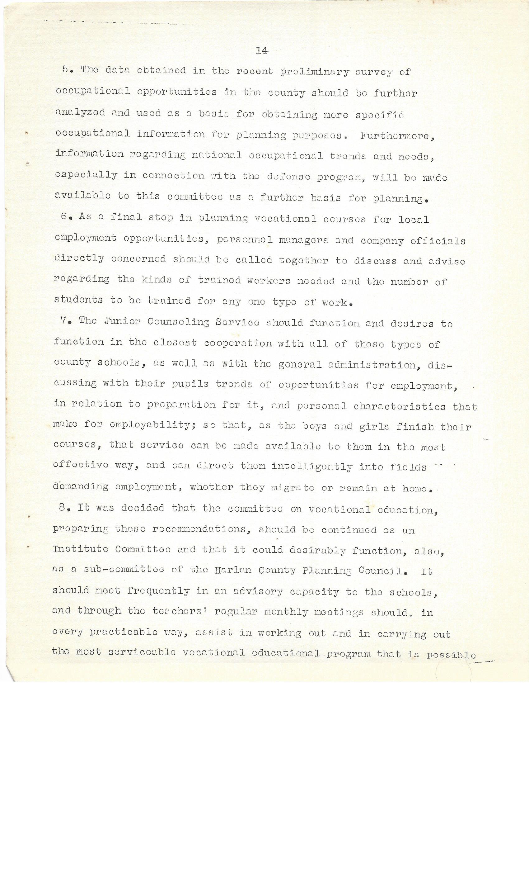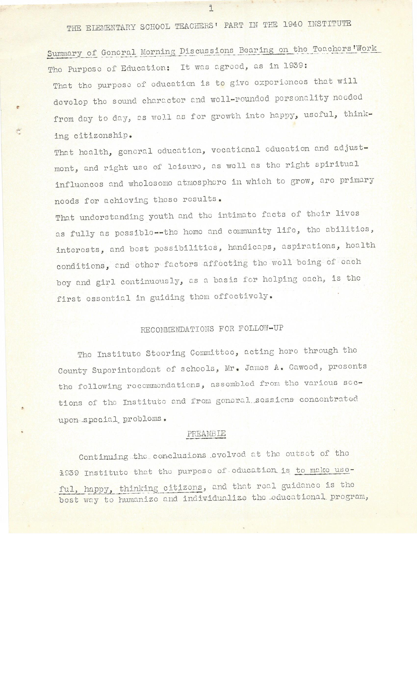 Excerpts taken from the findings of the 1940 RURAL YOUTH GUIDANCE INSTITUTE an annual week-long meeting of Harlan County teachers, parents, ministers, and other youth leaders from across the country. It was held at the Pine Mountain Settlement School where most of the earlier meetings had been located. The Alliance for Guidance of Rural Youth of Richmond, Virginia, sponsored the meeting.