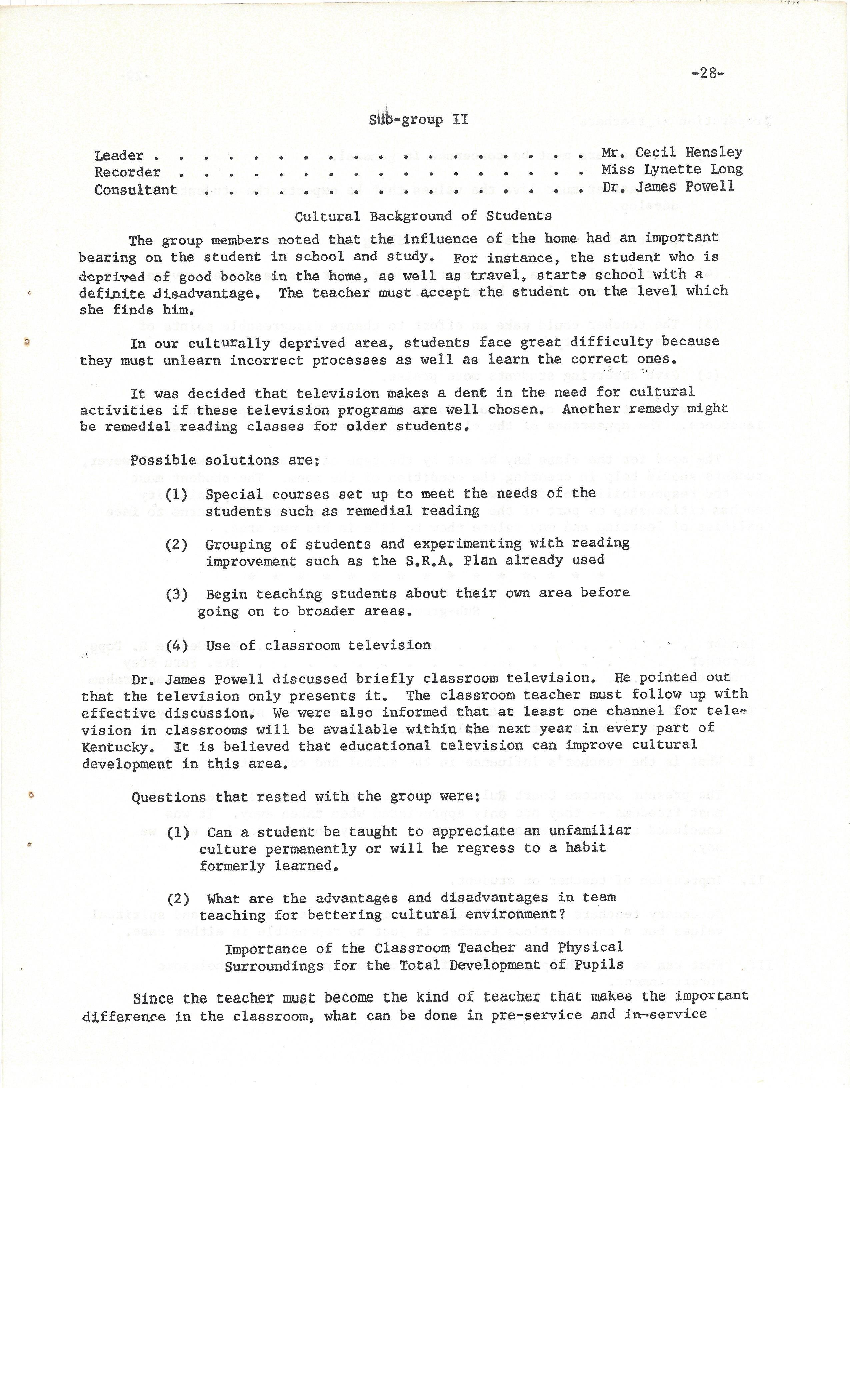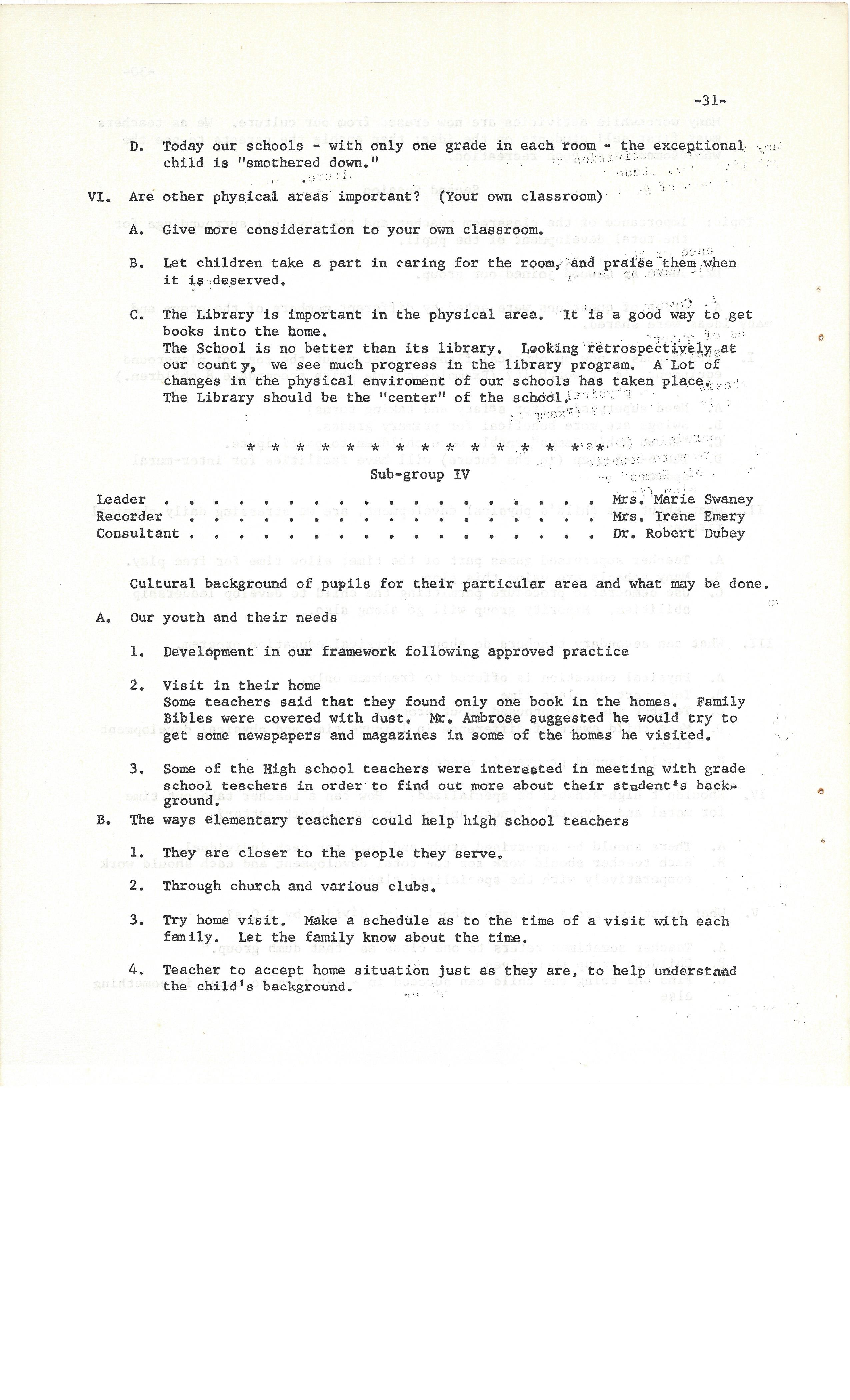 After much discussion, Sub Group I came to the conclusion that many seemingly insurmountable obstacles facing the students of our area could become bridges of understanding and appreciation if the classroom teacher would thoroughly familiarize himself with the cultural background of his students. On the high school level it was agreed that the homeroom teacher is in an excellent position to obtain a wealth of information about his pupils which would make his teaching more effective and the lives of those entrusted to his care more significant.