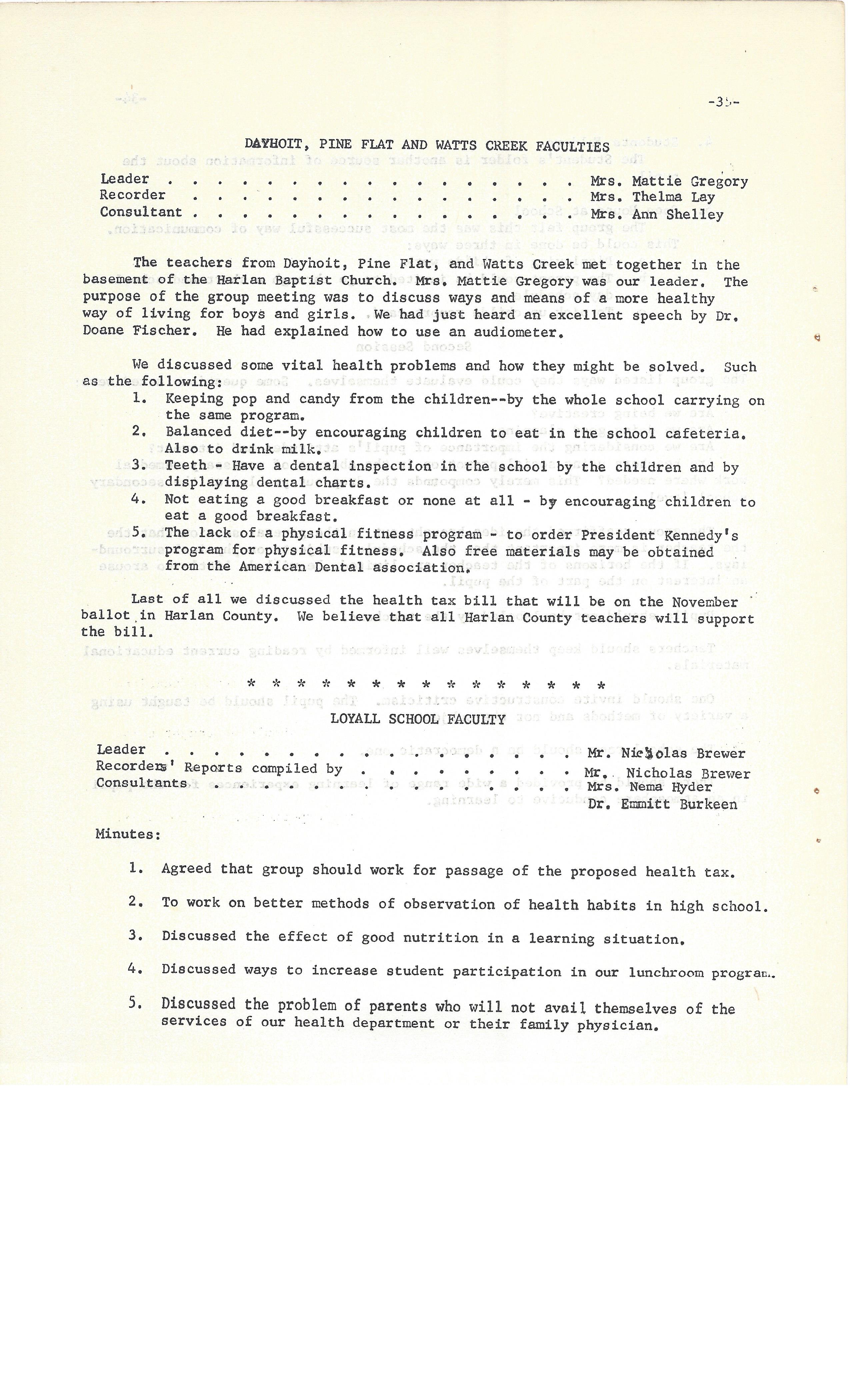 TAGS: 1963 Guidance Institute Report (pp. 26-37) ; Harlan (KY) County Board of Education ; Harlan Independent Board of Education ; Lynch Independent Board of Education ; drop-out problems ; social problems ; transportation problems ; cultural conflicts ; narrow vision ; unfair classifications ; importance of teachers ; physical surroundings ; classroom television ; physical education ; health education ; teachers helping teachers ; Dayhoit, Pine Flat and Watts Creek Faculties ; Loyall School Faculty ; health tax ;