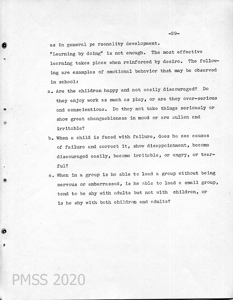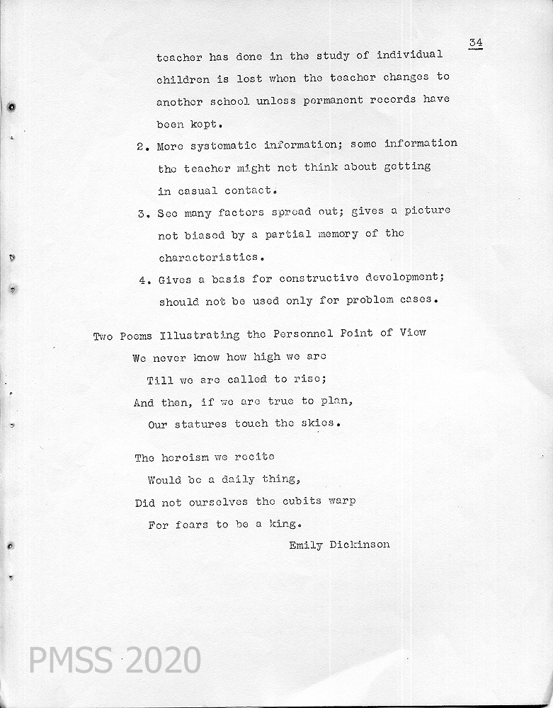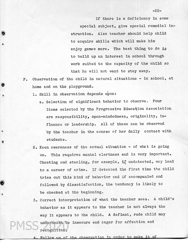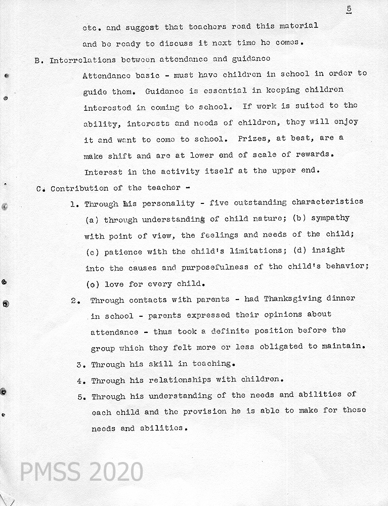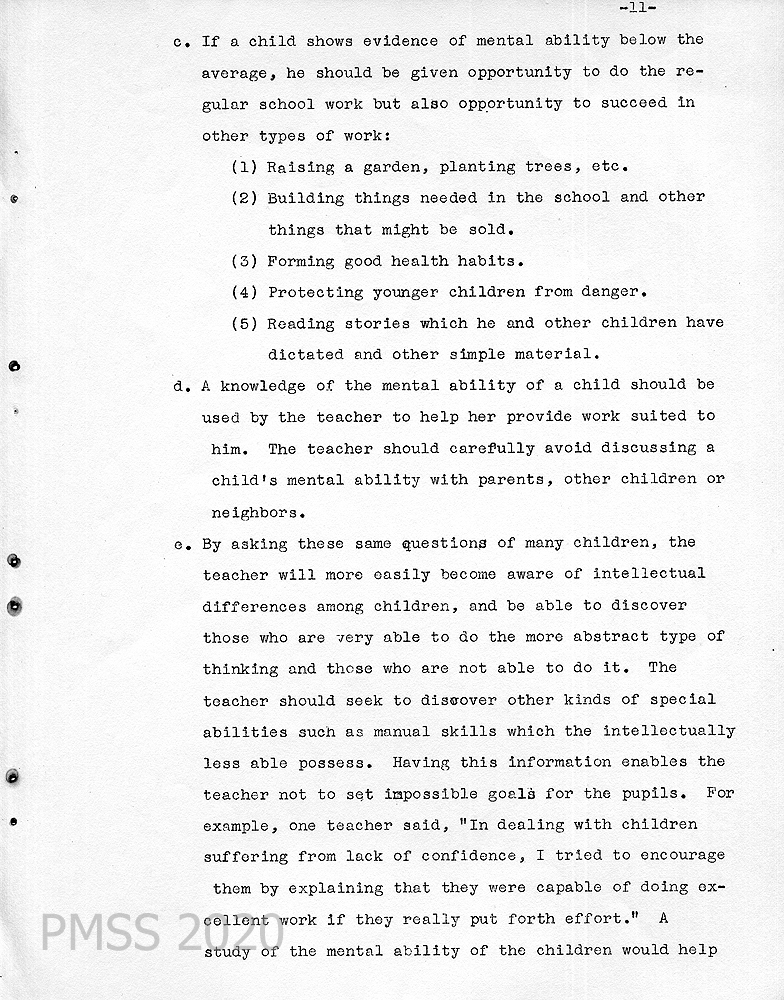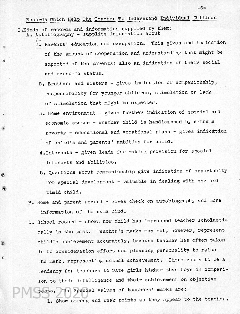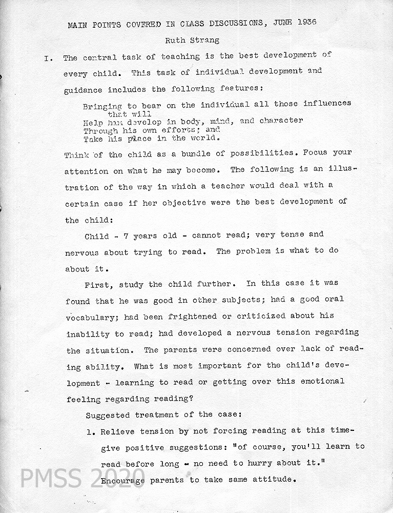 I. Main Points Covered in Class Discussions, June 1936. I. The central task of teaching is the best development of every child. … Think of the child as a bundle of possibilities. Focus your attention on what he may become. … [Provides a case example and suggested treatment of the case].