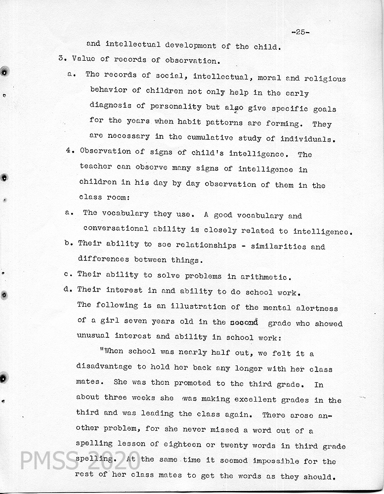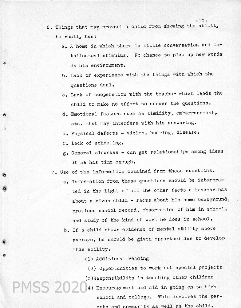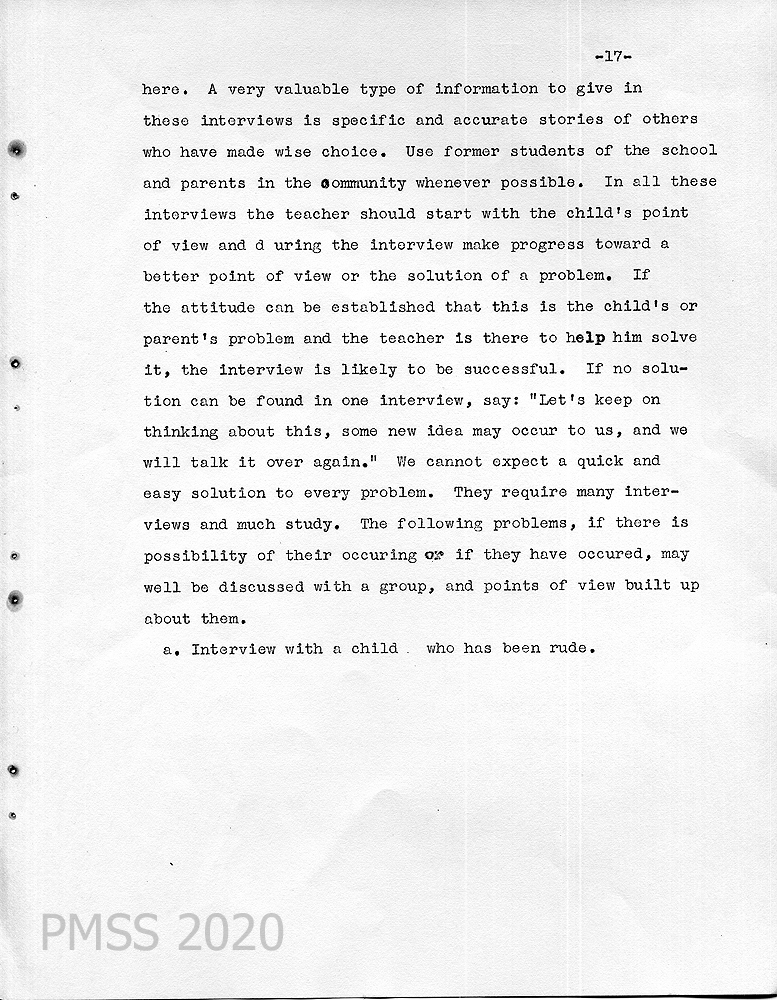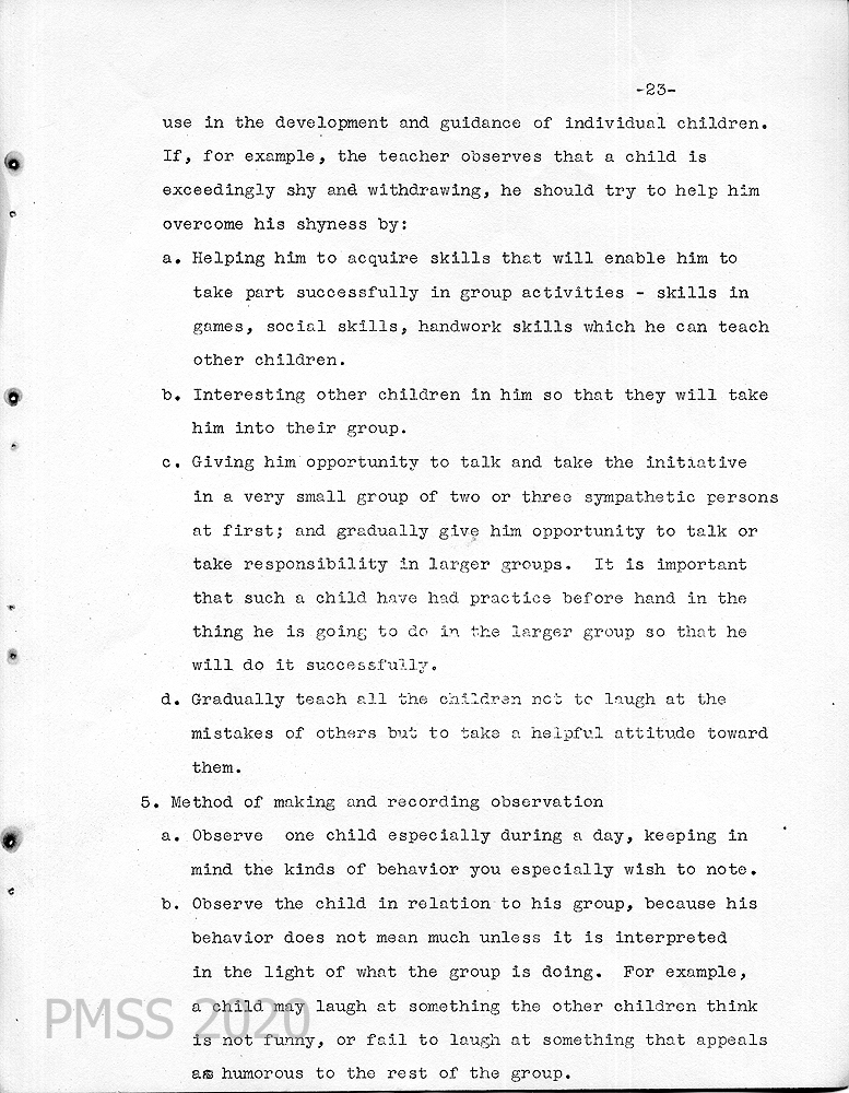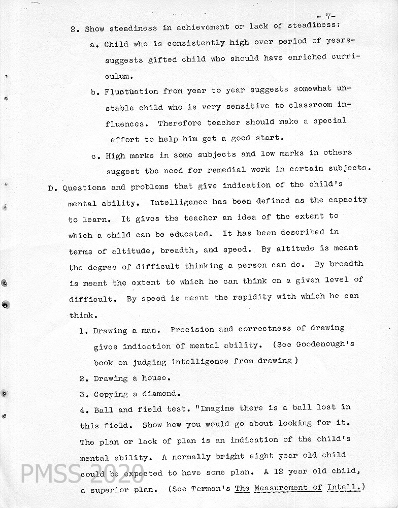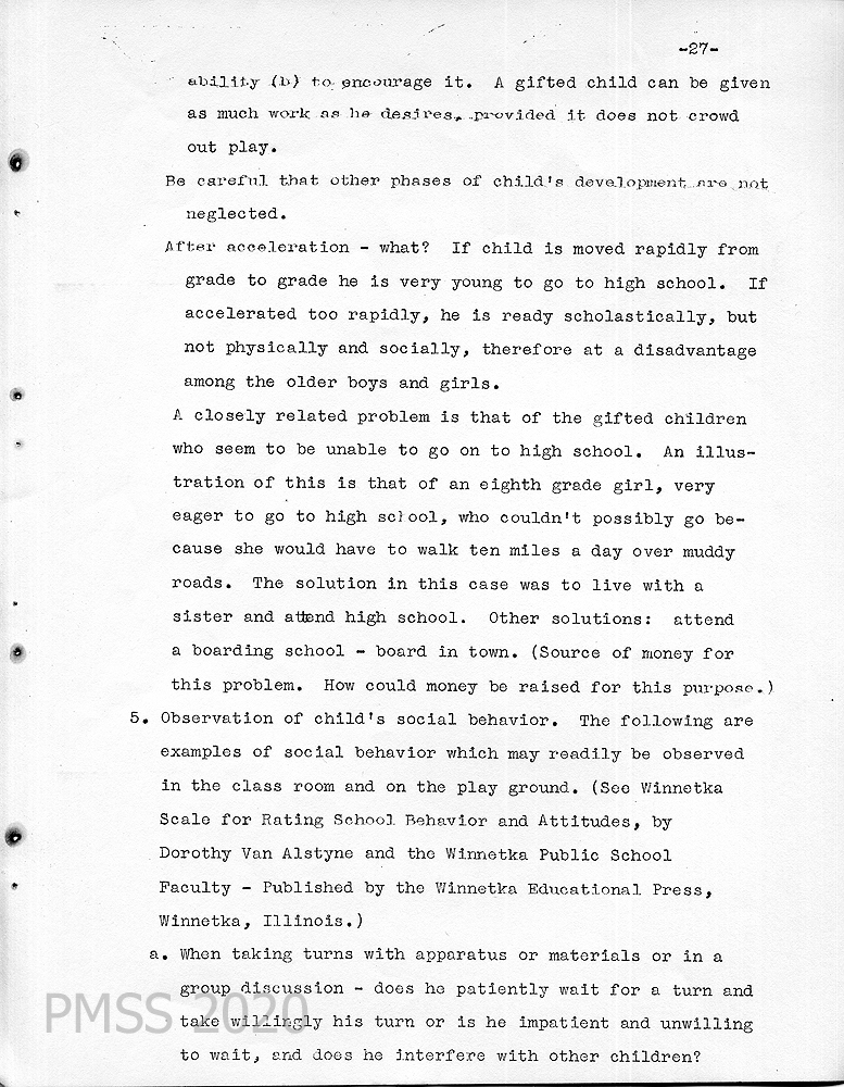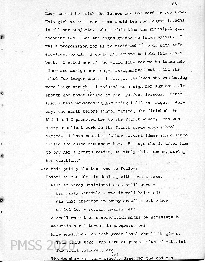 I. Main Points Covered in Class Discussions, June 1936. I. The central task of teaching is the best development of every child. … Think of the child as a bundle of possibilities. Focus your attention on what he may become. … [Provides a case example and suggested treatment of the case].