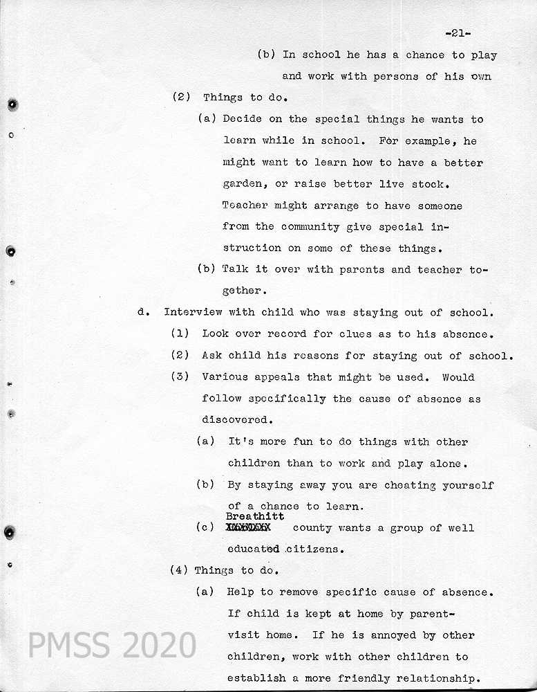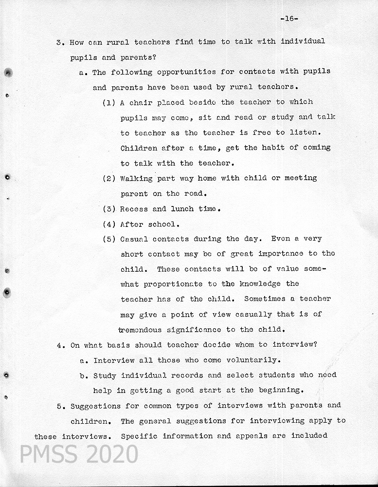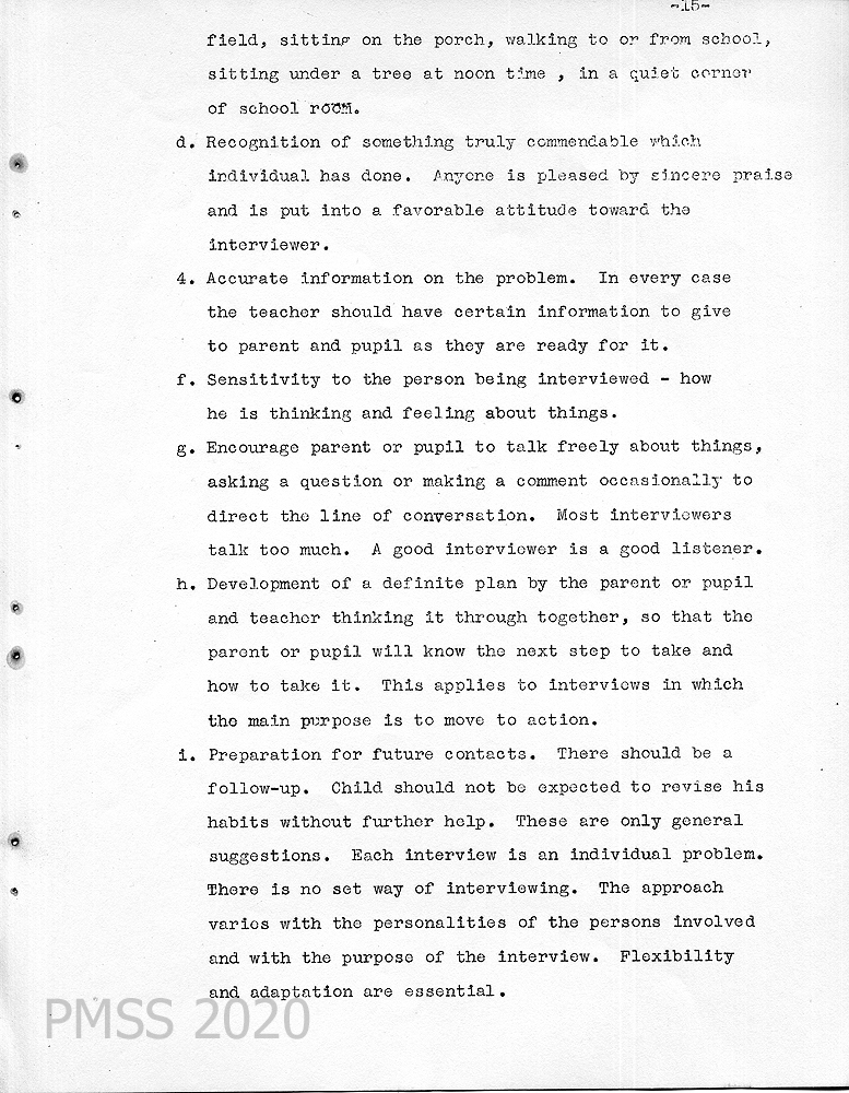 [Continued: List of ways toward a successful teacher/parent interview: how to “find time and opportunity to talk with individual pupils and parents.” and how to decide whom to interview.]