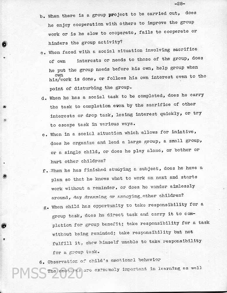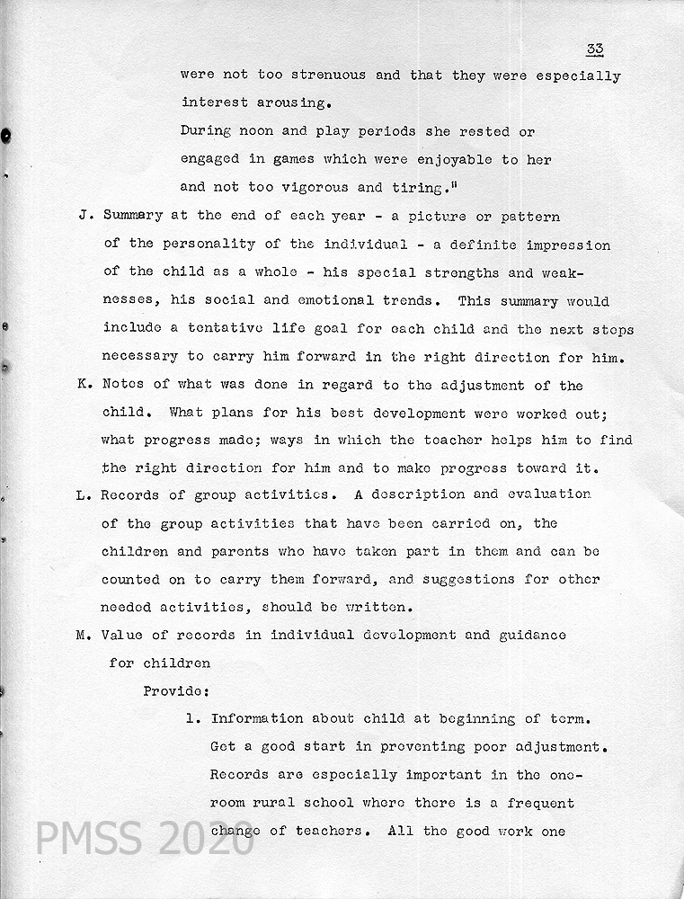 J. Summary at the end of each year — a picture or pattern of the personality of the individual – a definite impression of the child as a whole … [including] a tentative life goal …