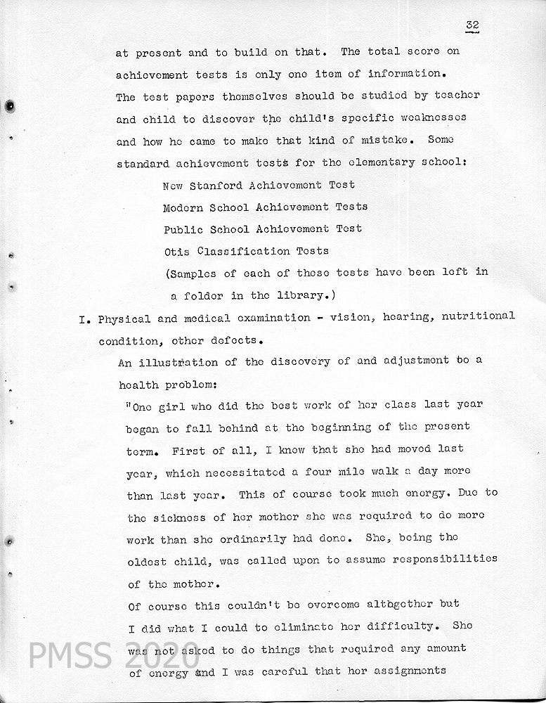 I. Physical and medical examination – vision, hearing, nutritional condition, other defects. … [Provides example.]