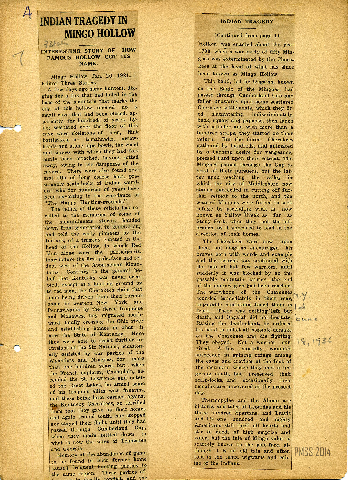 “Indian Tragedy in Mingo Hollow. Interesting Story of How Famous Hollow Got Its Name.” Mingo Hollow, Jan. 26, 1921. Source unknown. Discusses: Mingoes ; Cherokee ; Mingo Hollow ; Yellow Creek ; Oogalah, Eagle of the Mingoes ; Cumberland Gap ; Middlesboro ; Stony Fork ;