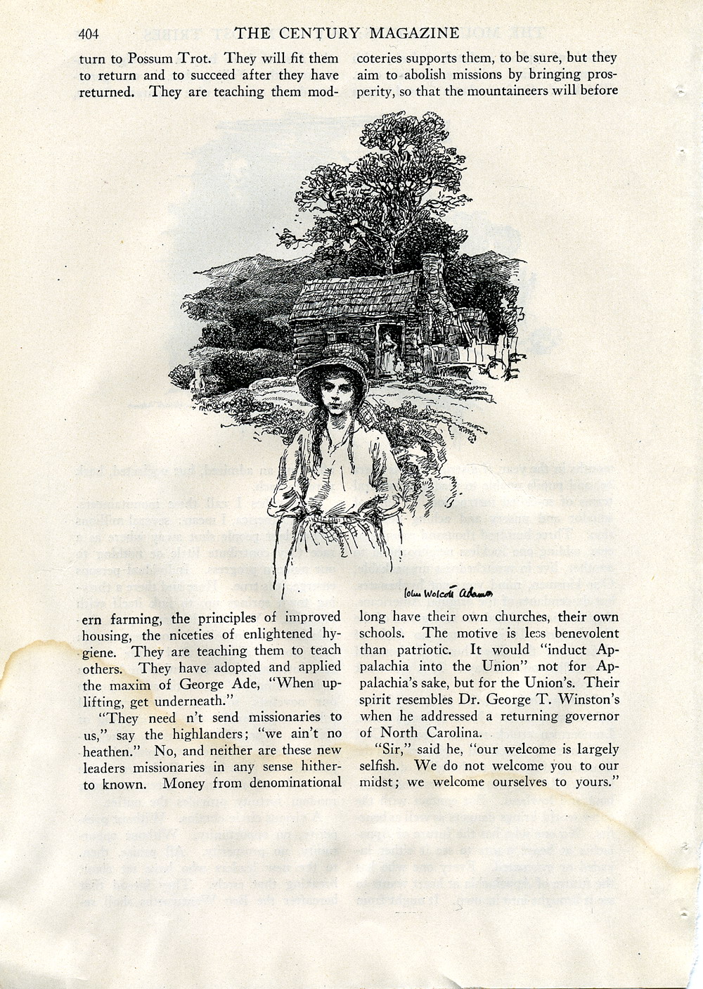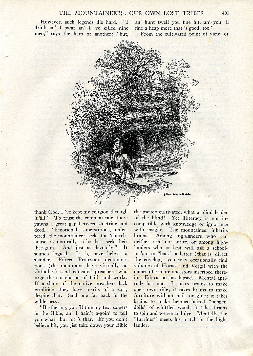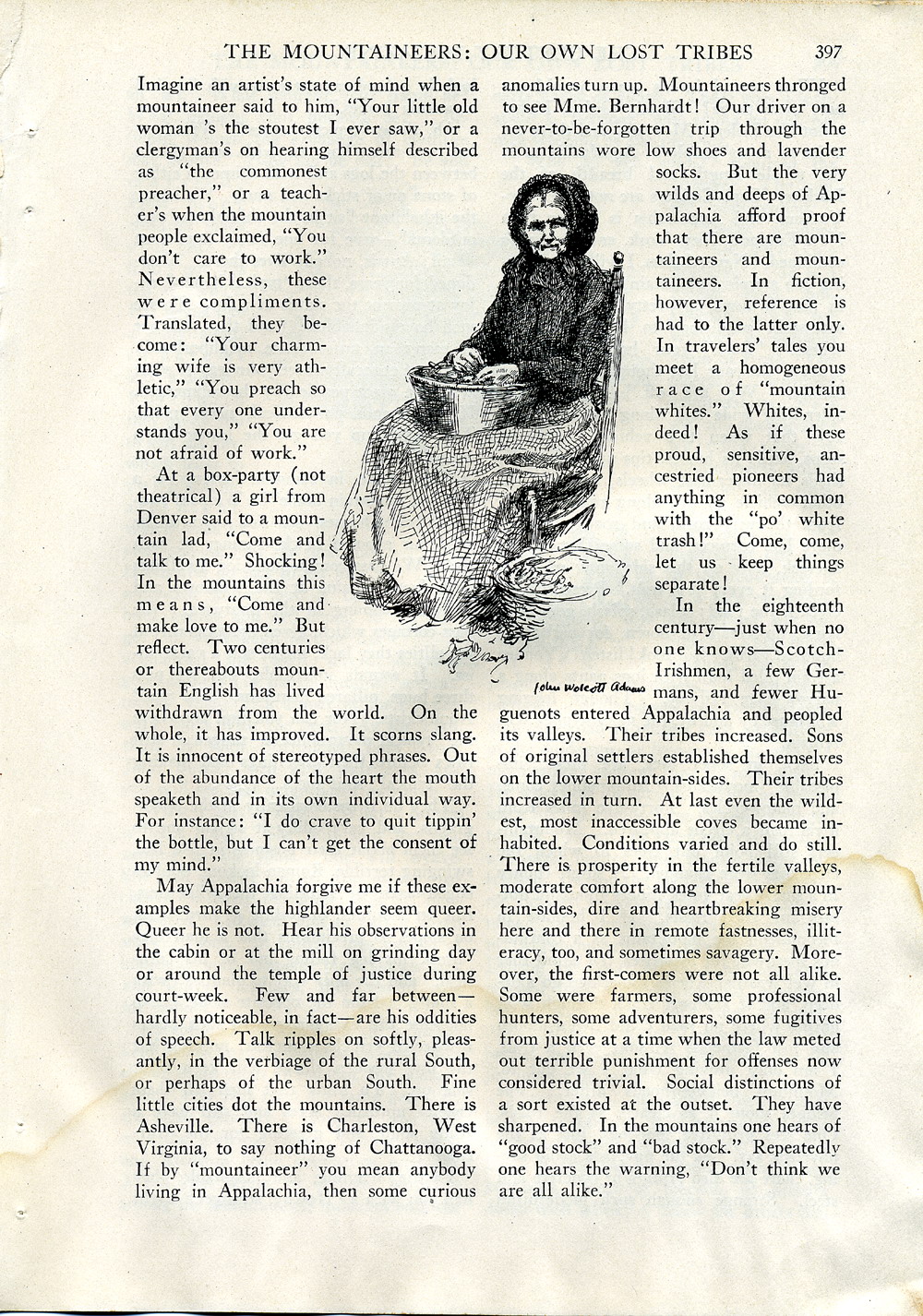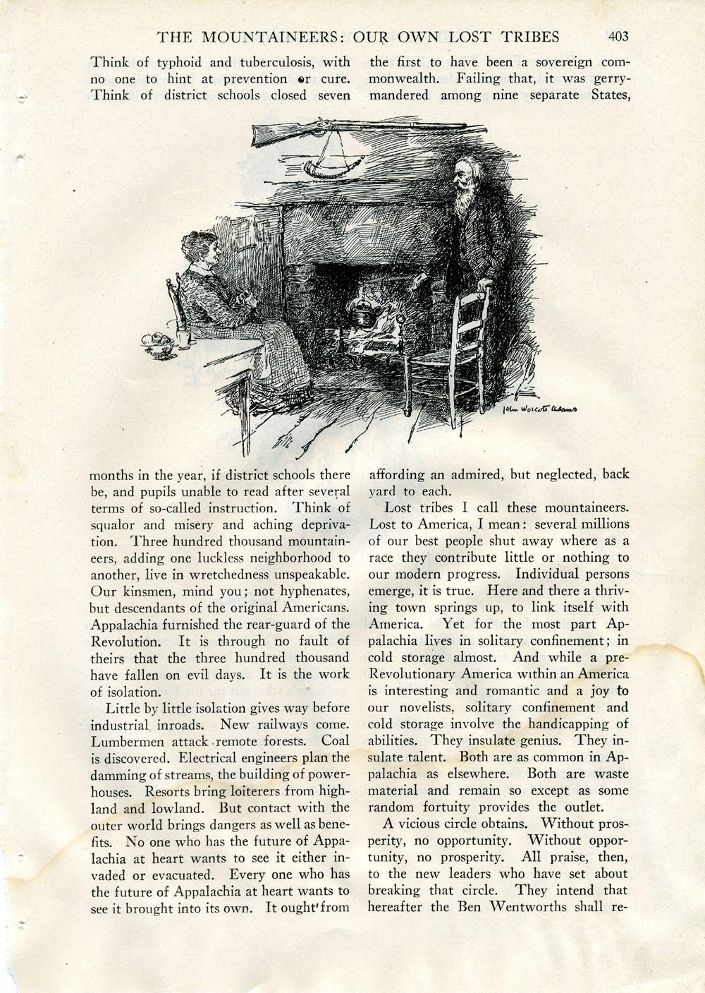 This article, “The Mountaineers: Our Own Lost Tribes,” describes the variety of life in the Central Appalachians during the first quarter of the twentieth century. Written by Rollin Lynde Hartt and illustrated by John Wolcott Adams, it was published as a vignette in the January 1918 issue of The Century Magazine, (New York City: volume 95, no. 3, pages 395 – 403), and also printed by The Century Company in 1918 as a book with the same title.