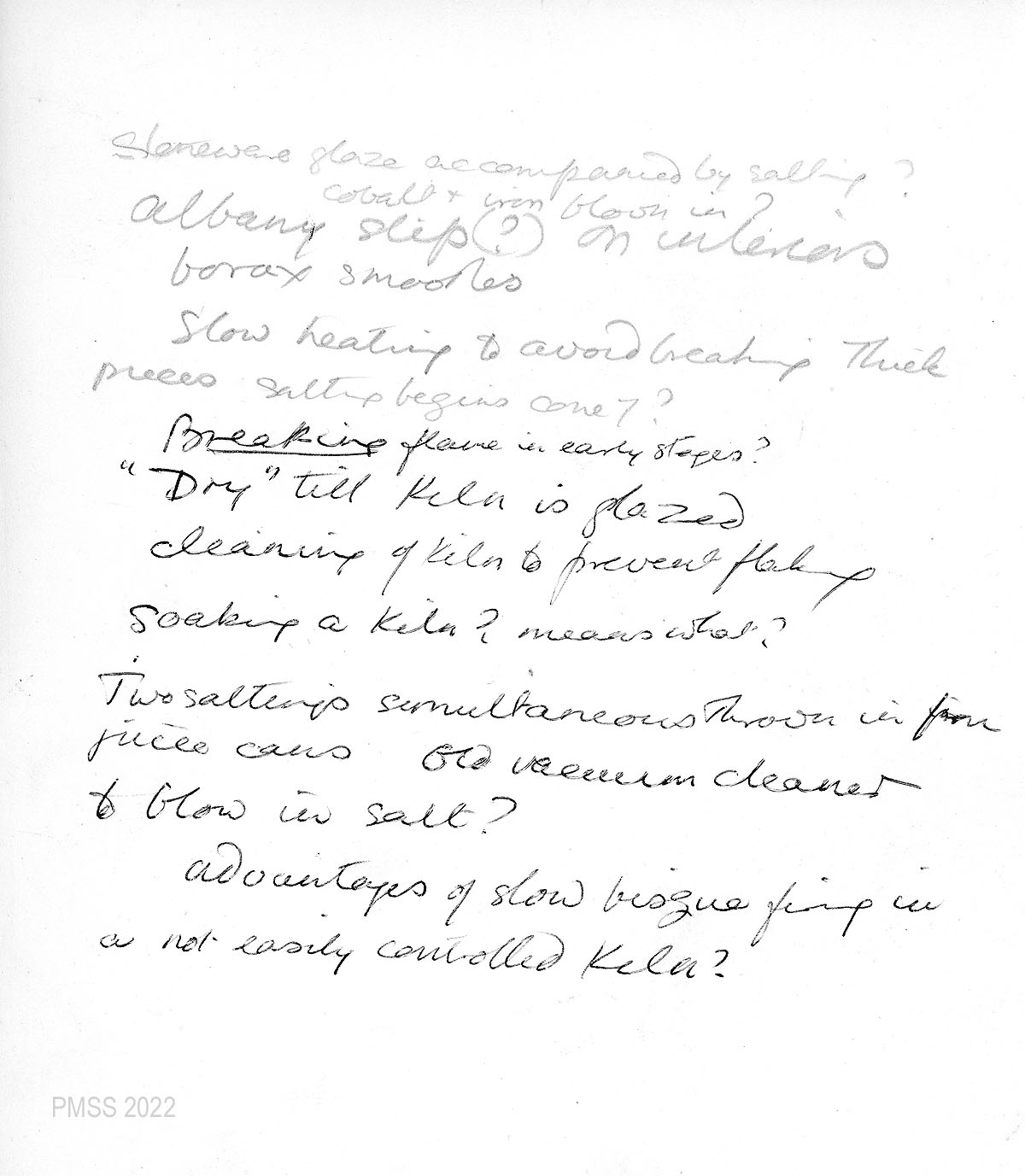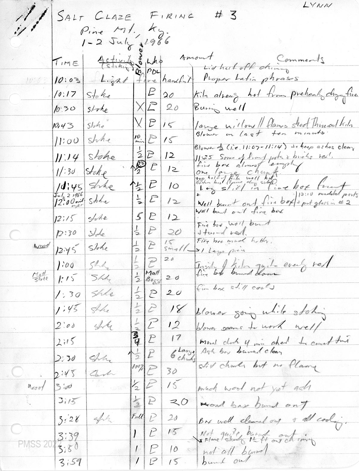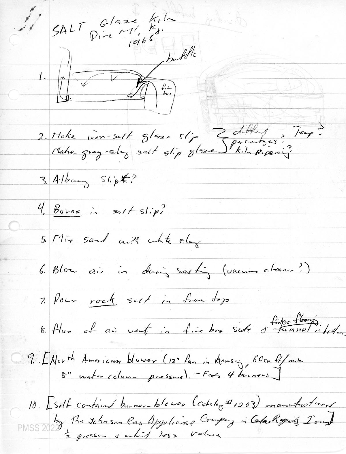 - CORRESPONDENCE April 28, 1966, Paul Lynn to Prof. Clayton Bailey, Whitewater State U., Whitewater, Wis., Lynn advises that PMSS has been “… setting up a primitive salt glaze kiln (approx. 18 cu. ft.) which is fired by wood. We are making use of about three different local clays and firing about cone 3.