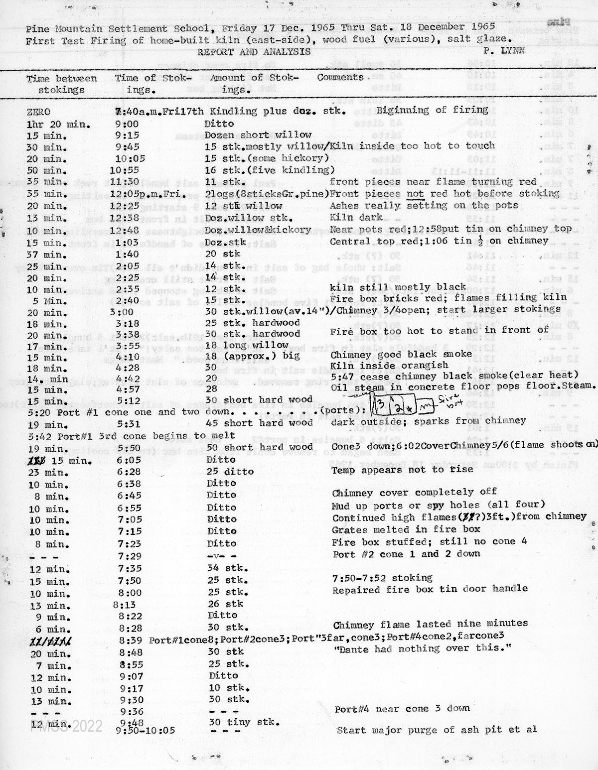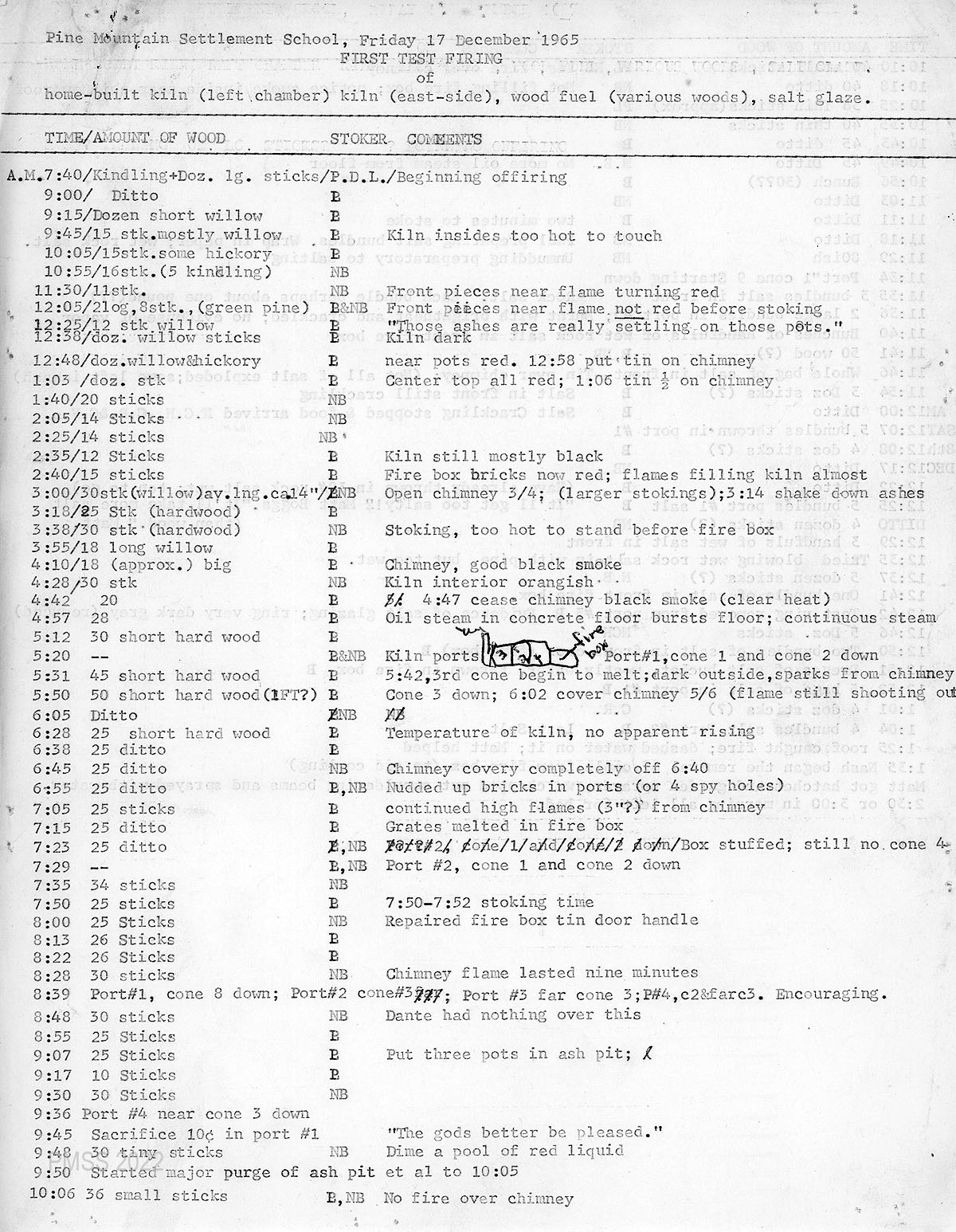 - PINE MOUNTAIN SETTLEMENT SCHOOL, Friday 17, December 1965. Thru Saturday 18 December 1965. FIRST TEST FIRING of Home-built kiln (east-side), wood fuel (various), salt-glaze. REPORT AND ANALYSIS. [1 pg. copy with 4 duplicates.]