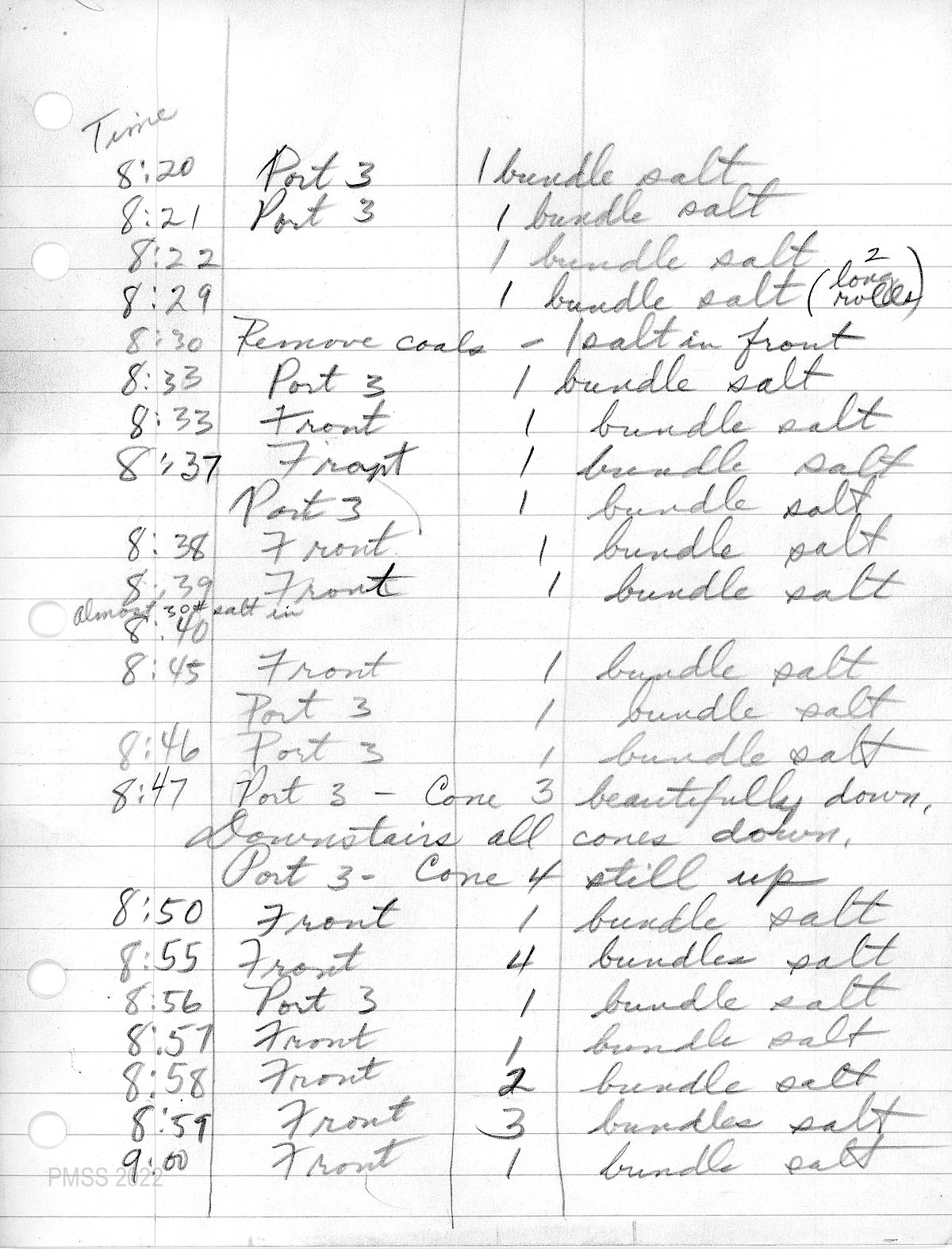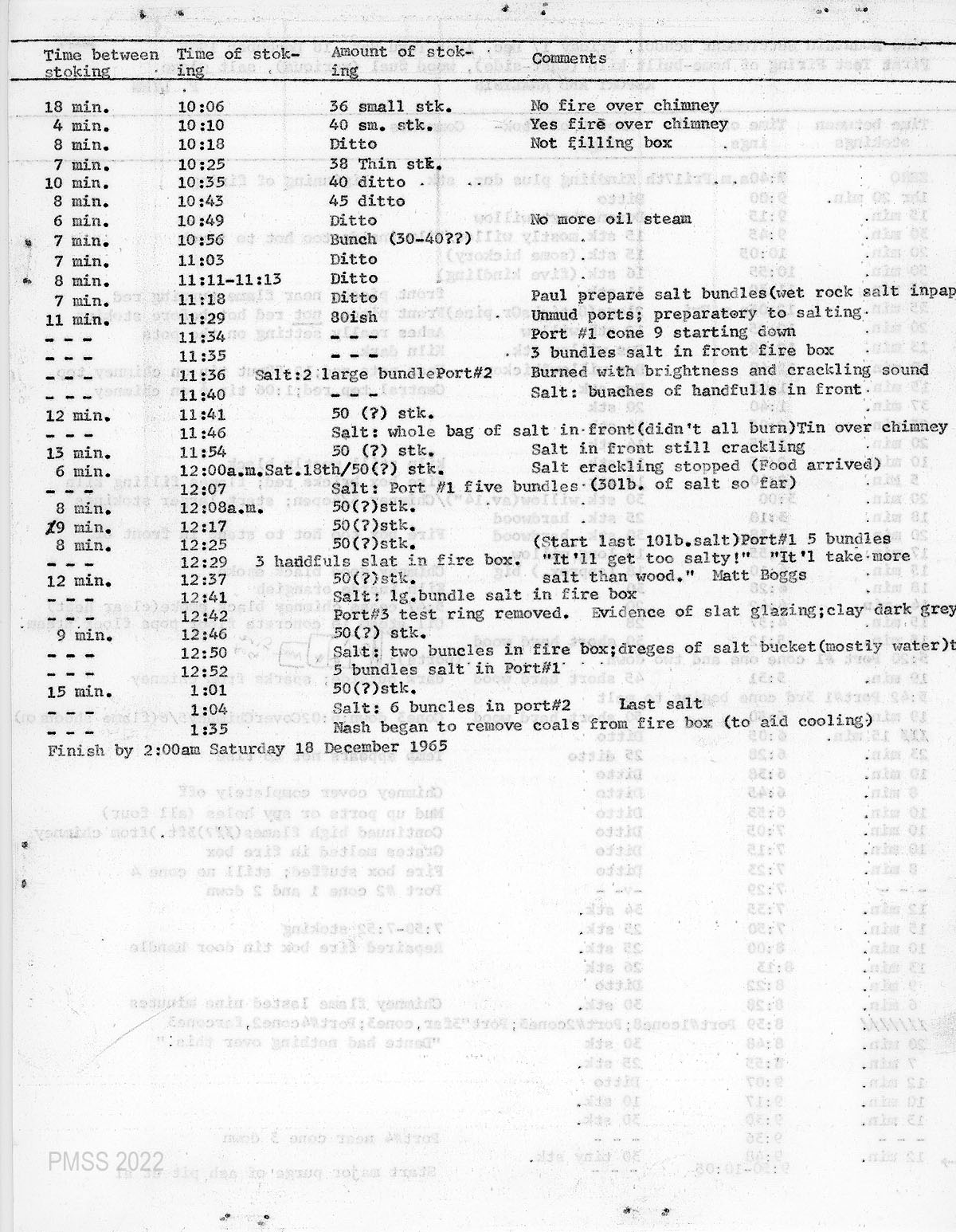 FIRST TEST FIRING of East-side kiln (salt-glaze). [2 pgs.] - STOKER NOTES. [on December firing ?] 3 pages.