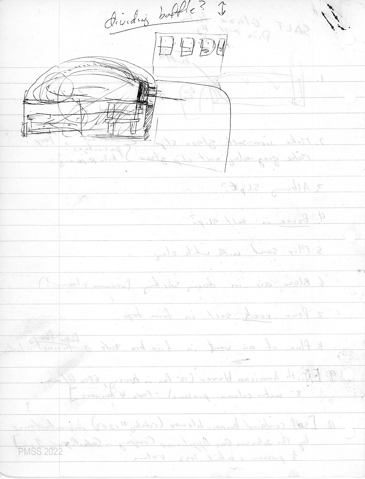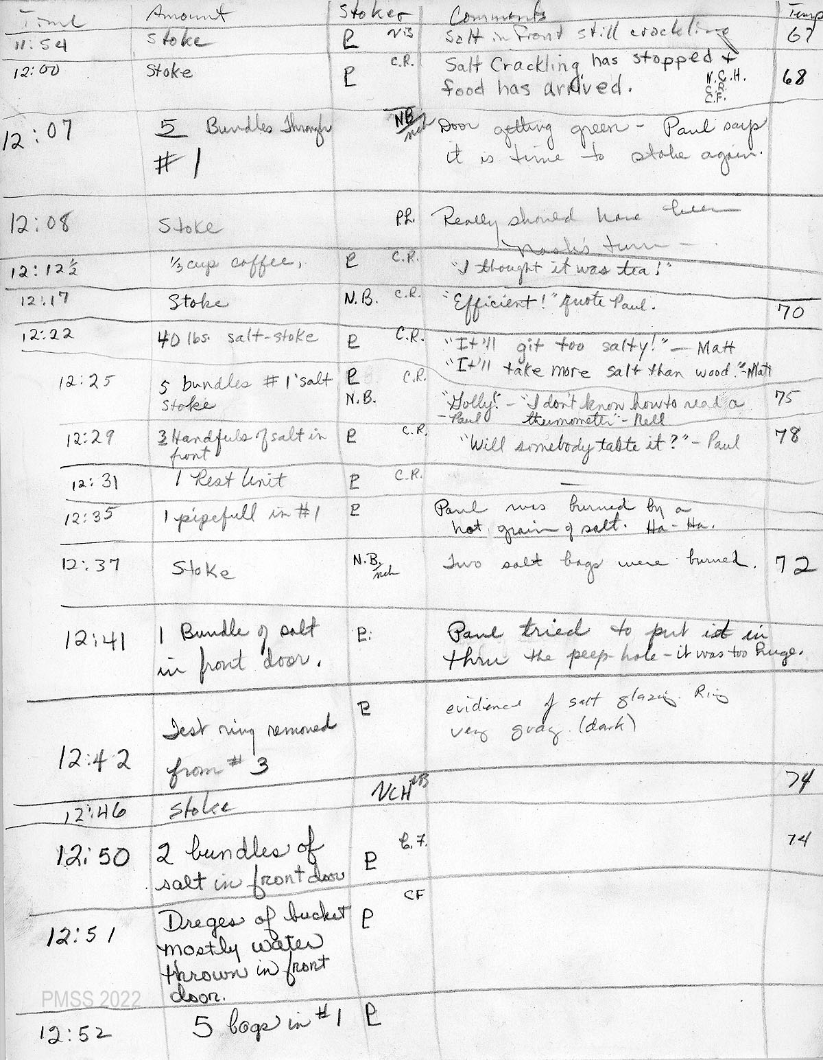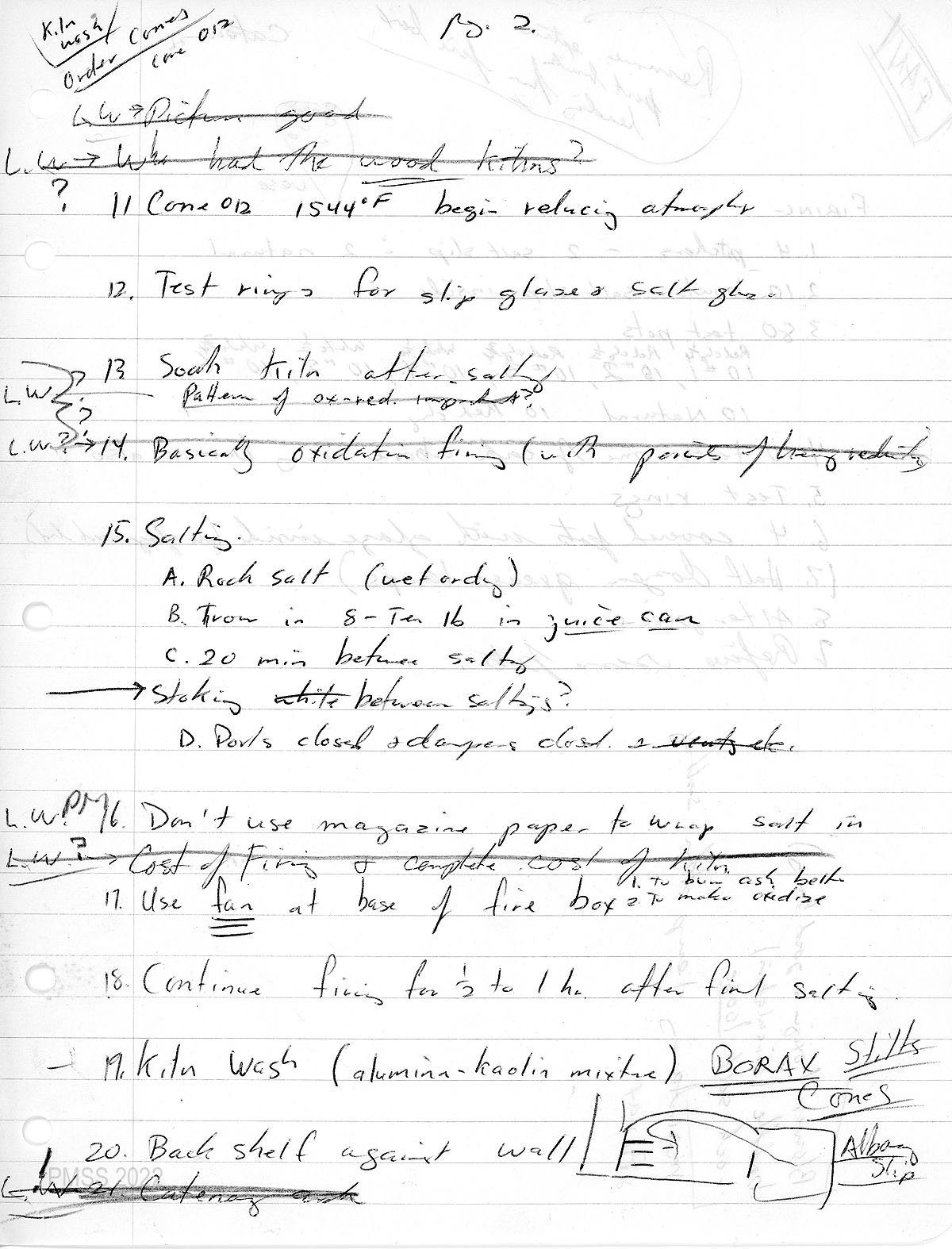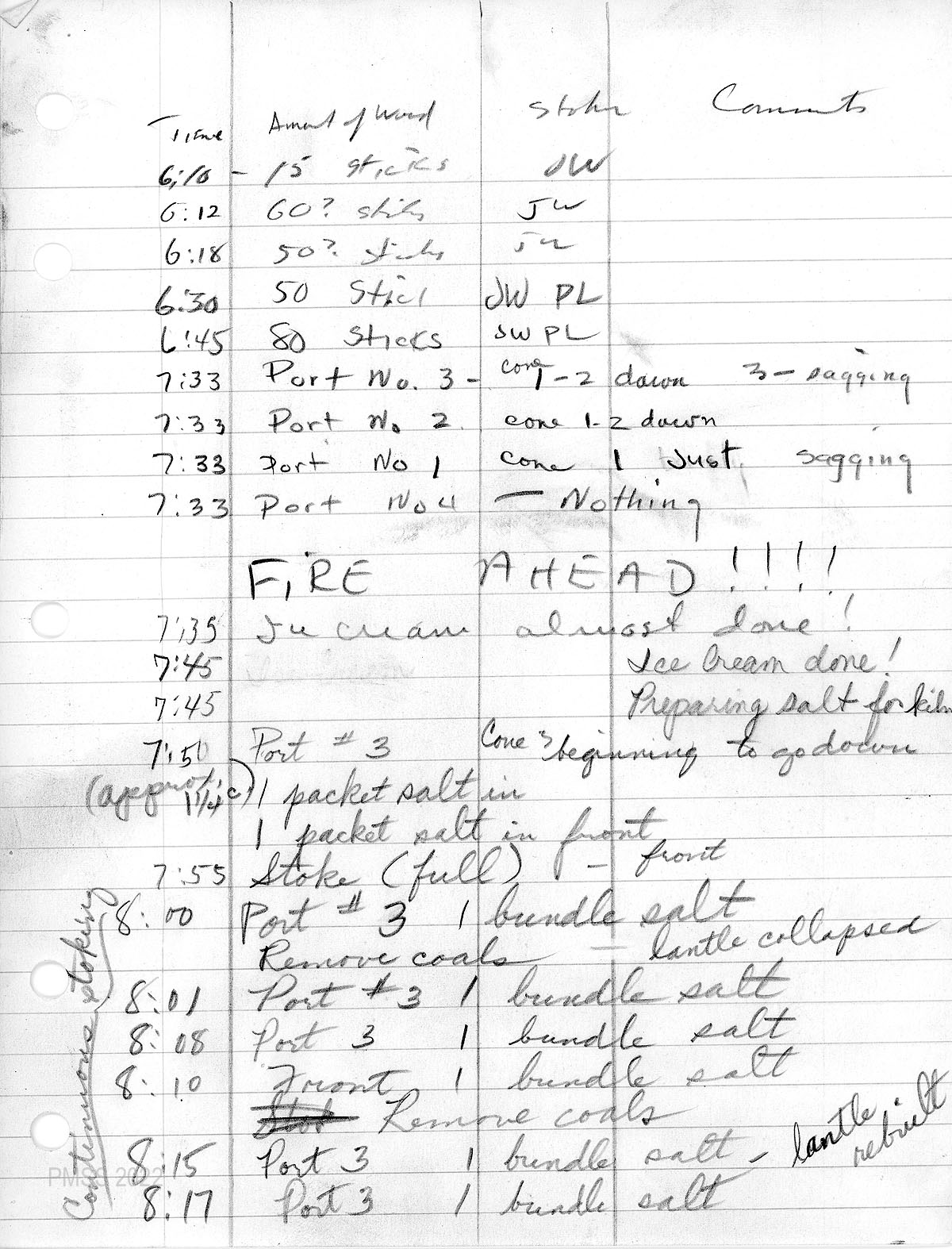 FIRST TEST FIRING of Home-built kiln (left chamber) kiln (east-side), wood fuel (various woods) salt glaze. [1 pg. copy with 4 duplicates and 1 attached note. ] - [Attached note} Raises questions regarding stoneware glaze with salting (Albany slip (?) and multiple other questions regarding the firing process.]