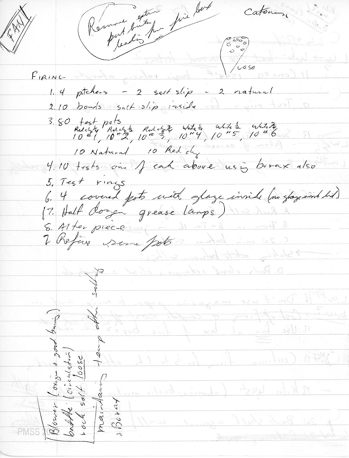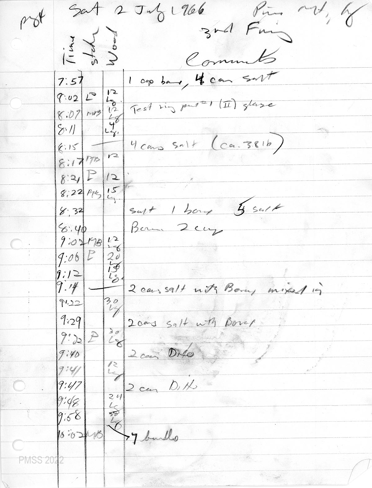 Included also are handwritten records of second test-firing (26 Mar. 1966) and a salt-glaze firing (#3:+1-2 July 1966) These items are not reproduced here.”