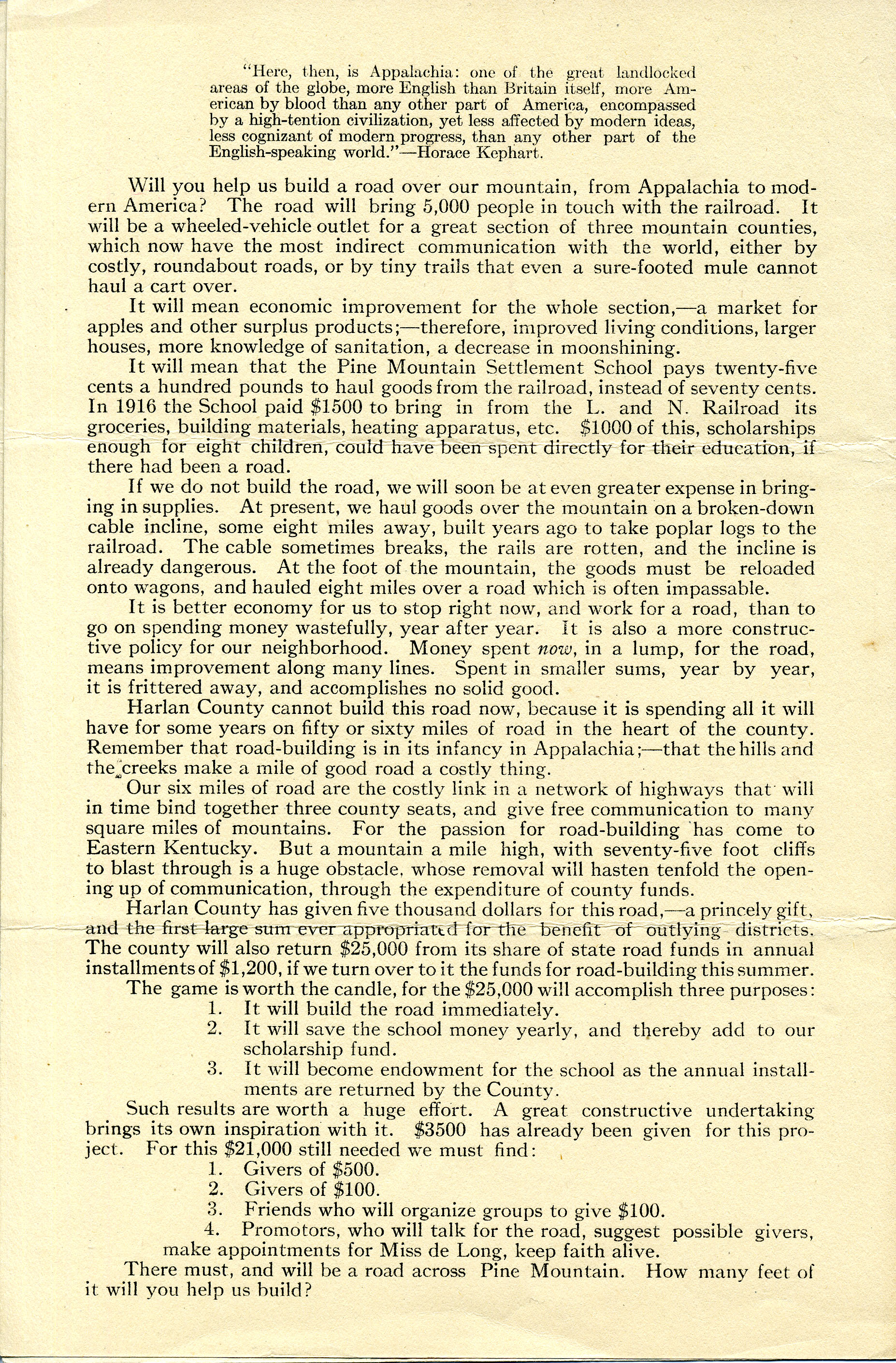 Will you help us build a road over our mountain, from Appalachia to modern America? The road will bring 5,000 people in touch with the railroad. It will be a wheeled-vehicle outlet for a great section of three mountain counties, which now have the most indirect communication with the world, either by costly, roundabout roads, or by tiny trails that even a sure-footed mule cannot haul a cart over.