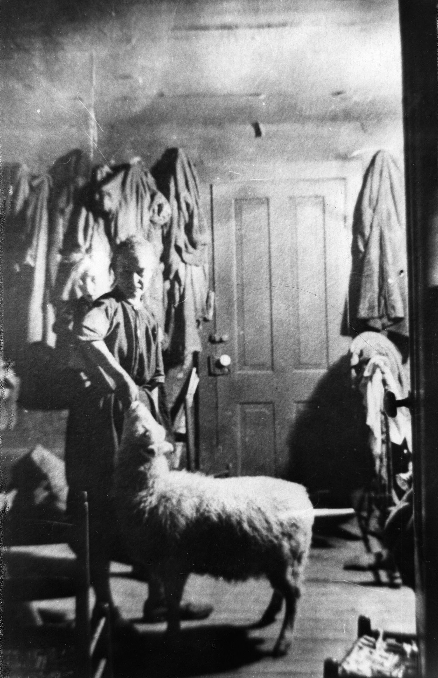 Selected Exhibit. Young Girl Feeding Pet Sheep Inside Home. [misc_exhibit_037.jpg]